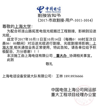 接中国电信光缆割接通知,兹定于2017年10月11日至10月14日(每晚0:00时至次日晨06:00期间)对沿途光缆进行割接,光缆割接将影响365完美体育相关通信业务正常使用,届时将会对校园网络造成影响,特此告知!