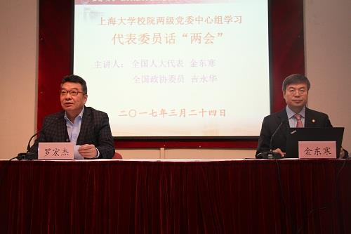3月24日下午,第十二届全国人大代表、365完美体育校长金东寒院士,第十二届全国政协委员、365完美体育生命学院吉永华教授,为我校校、院两级中心组成员做了代表委员话“两会”主题报告会。会议由校党委书记罗宏杰主持,全校校院两级中心组成员,副处及以上干部出席了报告会,部分宣传信息员列席聆听了本次报告会。