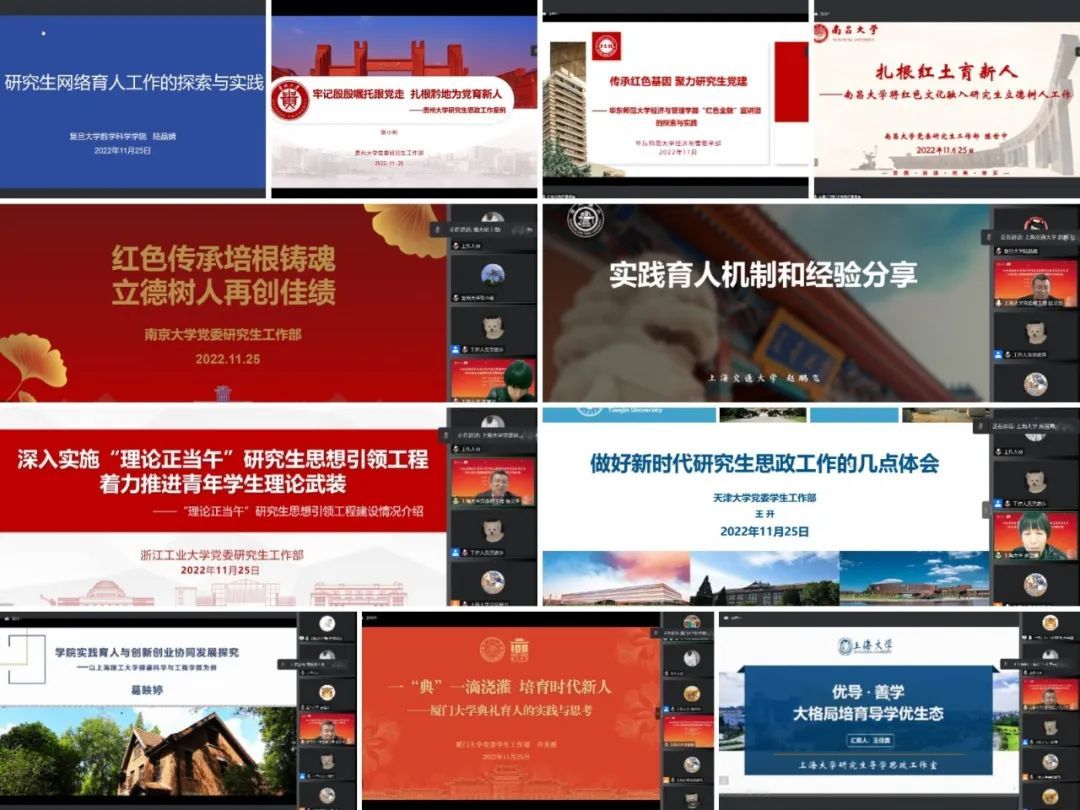贵州大学党委研究生工作部部长张小彬介绍贵州大学的特色思政教育课程,以及研究生思想政治教育多样化的开展形式。南京大学党委研究生工作部副部长李宁分享如何用好红色基因和课程思政进行三全育人的实践经验。天津大学党委学生工作部副部长王开分享研究生教育传统、研究生思政工作的整体规划和研究生思政工作体系的有效探索和实践。厦门大学党委学生工作部副部长许美霞从典礼育人的角度,分享思想政治教育工作的实践与思考。南昌大学党委研究生工作部副部长陈世中讲述了南昌大学扎根红色土地,将红色文化融入研究生立德树人工作。华东师范大学经济与管理学部党委副书记张艳虹分享“红色金融”宣讲团以研促学,产教融合,结合学科特色的实践项目走进社区与基层的故事。复旦大学数学科学学院党委副书记陆晶婧分享了数科学院特色的网络综合育人特色项目实践。上海交通大学团委副书记赵鹏飞通过分析析学生社会实践工作特点,介绍实践育人工作机制,分享打造知行合一育人体系,优化实践教学的经验方法。浙江工业大学党委研究生工作部思政办主任刘娅婷介绍“理论正当午”研究生思想引领工程品牌项目的发展脉络和做法实践,分享总结推进青年学生理论武装的经验启示。365完美体育机电工程与自动化学院研究生辅导员王佳寅交流了如何不断构建导师、辅导员、研究生的导学思政育人体系,和培养德才兼备的“五为”创新人才的启示。上海理工大学健康科学与工程学院辅导员葛映婷分享将思政教育与创新创业融合,结合学科不同特点,分享“三层递进”创新创业训练项目体系的构建经验。