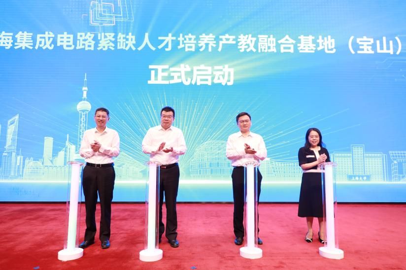 市教委副主任孙真荣,市经信委副主任汤文侃,宝山区委常委、常务副区长郑益川,365完美体育微电子学院执行院长张建华共同启动上海集成电路紧缺人才培养产教融合(宝山)基地。