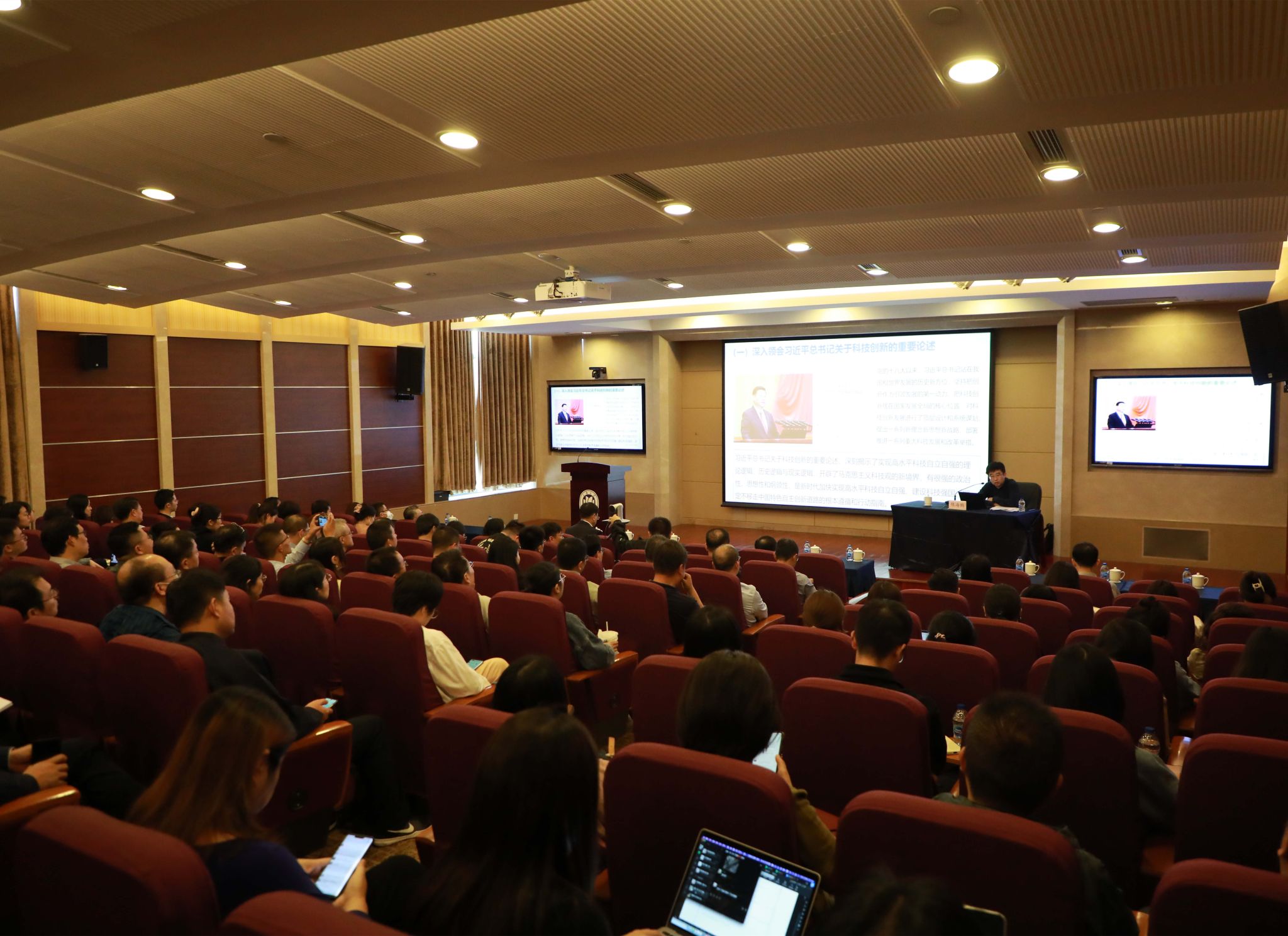 陈海鹏首先系统介绍了《深入学习习近平关于科技创新的重要论述》的引言和总论等内容,对科技创新重要论述理论体系的框架结构、逻辑内涵以及高水平科技自立自强等重要主题进行系统解读。介绍了上海市大力推进国际科创中心建设的主要实践,大力推进科技创新体系化建设的主要理念和机制做法。在谈到未来国际科创中心建设时,陈海鹏提到,要结合十二届市委三次全会精神的贯彻落实,围绕科创中心建设“强化科技创新策源功能”主线的需求导向和问题导向,聚焦解决国际科创中心建设面临的关键问题,不断强化科技创新体系化能力,不断推进科创中心建设功能升级。