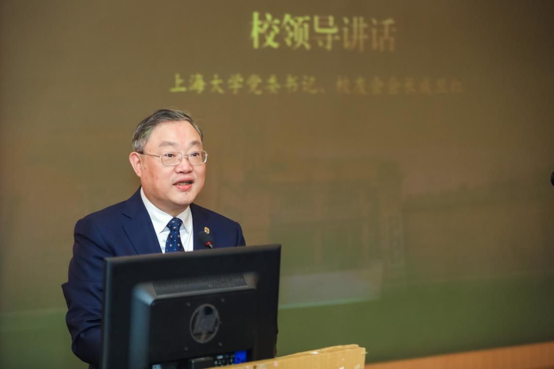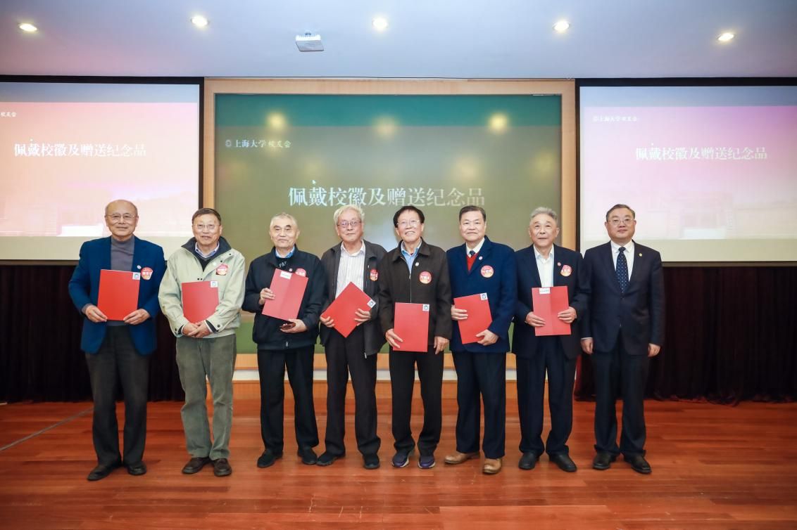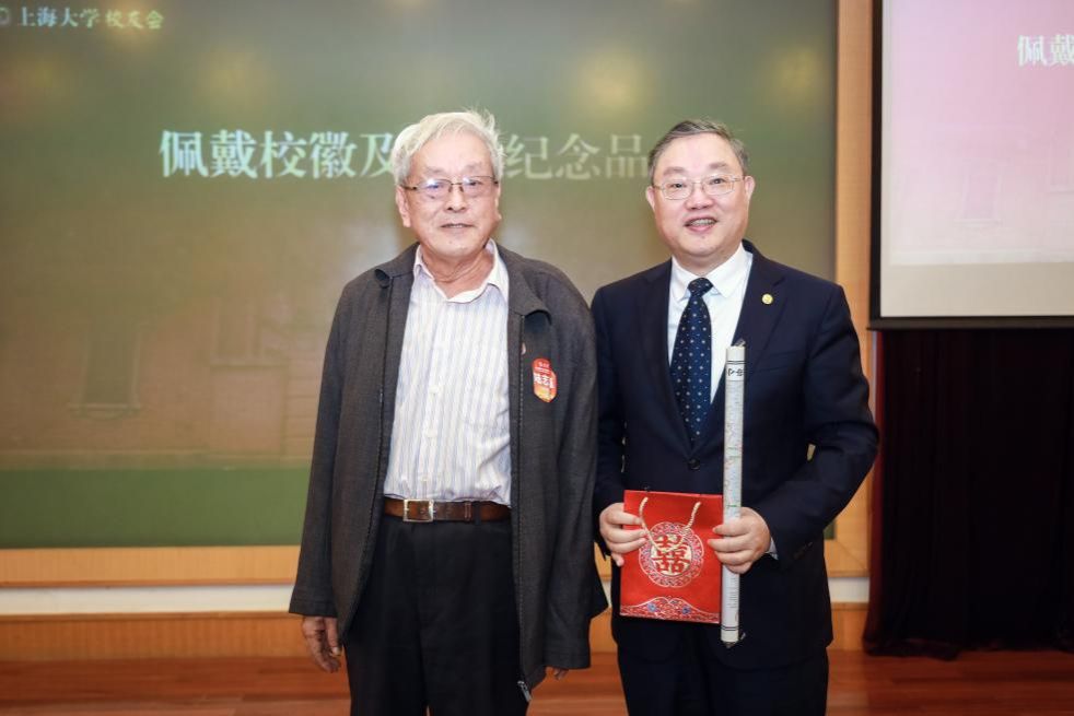 成旦红书记为校友代表佩戴象征“上大人”身份的校徽并赠送特制档案纪念品。一声上大人,一生上大情,“科二”校友也将秉持校训精神,赓续百年上大的红色血脉。