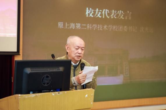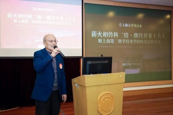 随后,校友代表依次发言。1966届校友郁世荣作为活动筹备组代表,向大家介绍了本次返校活动的巧妙缘起和筹备历程;1968届校友刘锦高带领大家回顾了“科二”的辉煌历史和卓越贡献;沈光远老师作为教师代表表达了师生团聚的喜悦和祝福;忻福良校长传递了对“科二”校友及今日上大的期待与鼓励。纸短情长、言不尽情,欢聚的氛围在掌声和歌声中掀起一次次高潮。