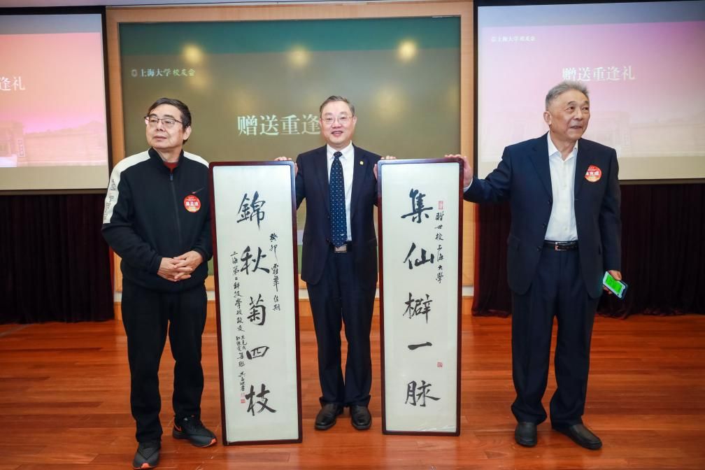 春风化雨,游子归心。在这个珍贵而难忘的时刻,1969届校友朱克成、1964届校友吴孟迪将亲笔拟定并题写的对联赠与母校。“集仙檘一脉,锦秋菊四枝”,分别代表“科二”与上大,象征着“科二”校友与母校的血脉深情。1968届校友陆志瑾向母校赠送一份珍藏的小三线研究地图史料,助力母校相关科研事业发展。成旦红书记代表学校接受赠礼。