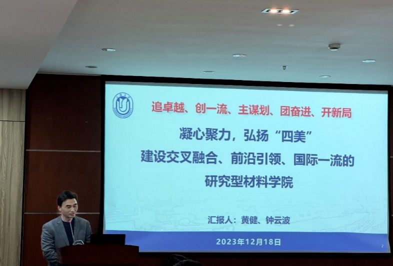 材料学院党委书记黄健以《凝心聚力弘扬“四美”建设交叉融合、前沿引领、国际一流的研究型材料学院》为题,从学院推进“五五战略”落地情况、高层次人才引育工作情况、推进党建和事业发展深度融合成效以及学院未来五年发展目标展望四个方面,向与会人员介绍材料学院近年来的发展概况及未来规划。他指出,我们要立足材料,聚焦和凝练发展方向,服务学校“五五战略”,在服务长三角一体化国家发展战略中成就一流材料学院。