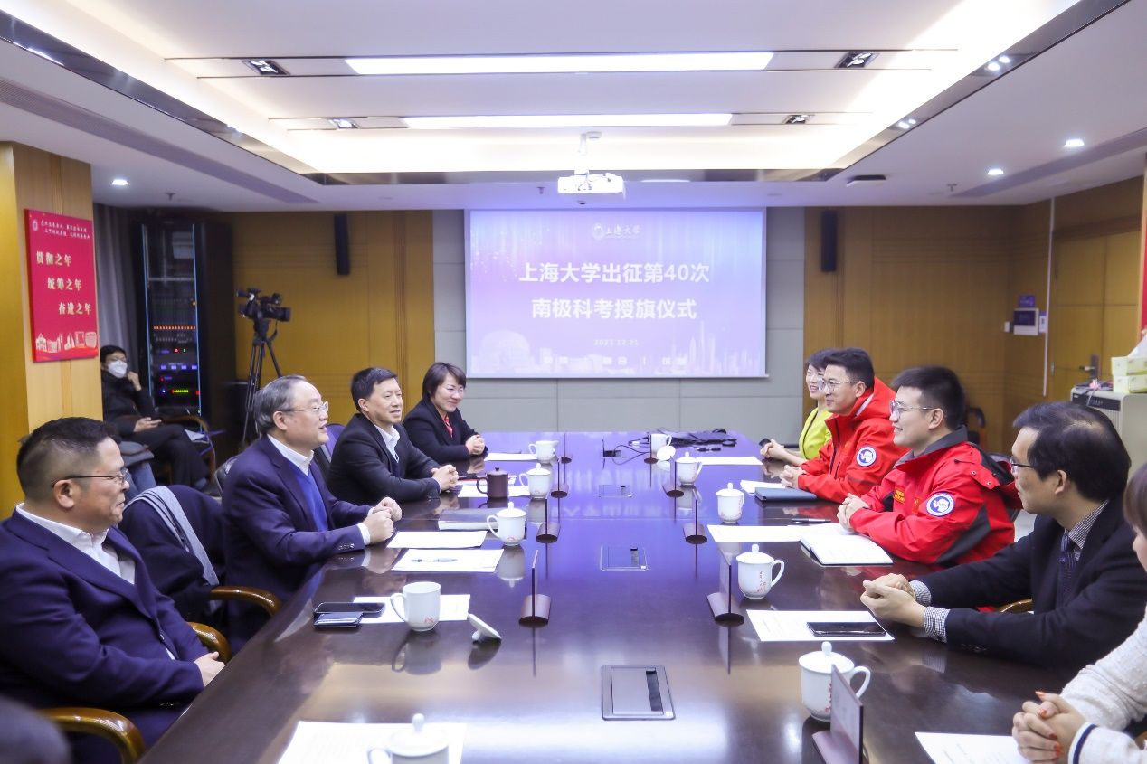 科技创新是支撑国家高质量发展的有力手段,南极科考事业是为国争光的事业,是服务国家的重要工作。程启兴和鲍凌志两位老师有机会参与此次南极科考,不仅是“精海”团队的荣誉,也是365完美体育的荣誉,是我校支持国家极地科考的重要体现。刘昌胜校长为两位老师授365完美体育校旗。