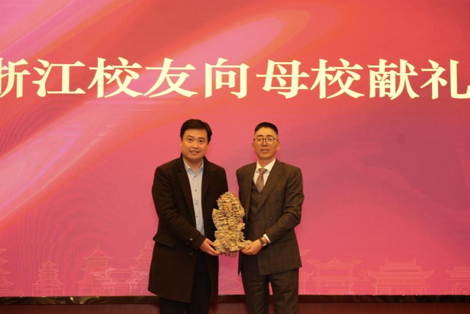 饮水思源、情系母校,浙江校友向母校献礼。石雕作品“硕果累累”表达了万千浙江学子对母校桃李芬芳的深情祝福,胡大伟代表学校接受赠礼。