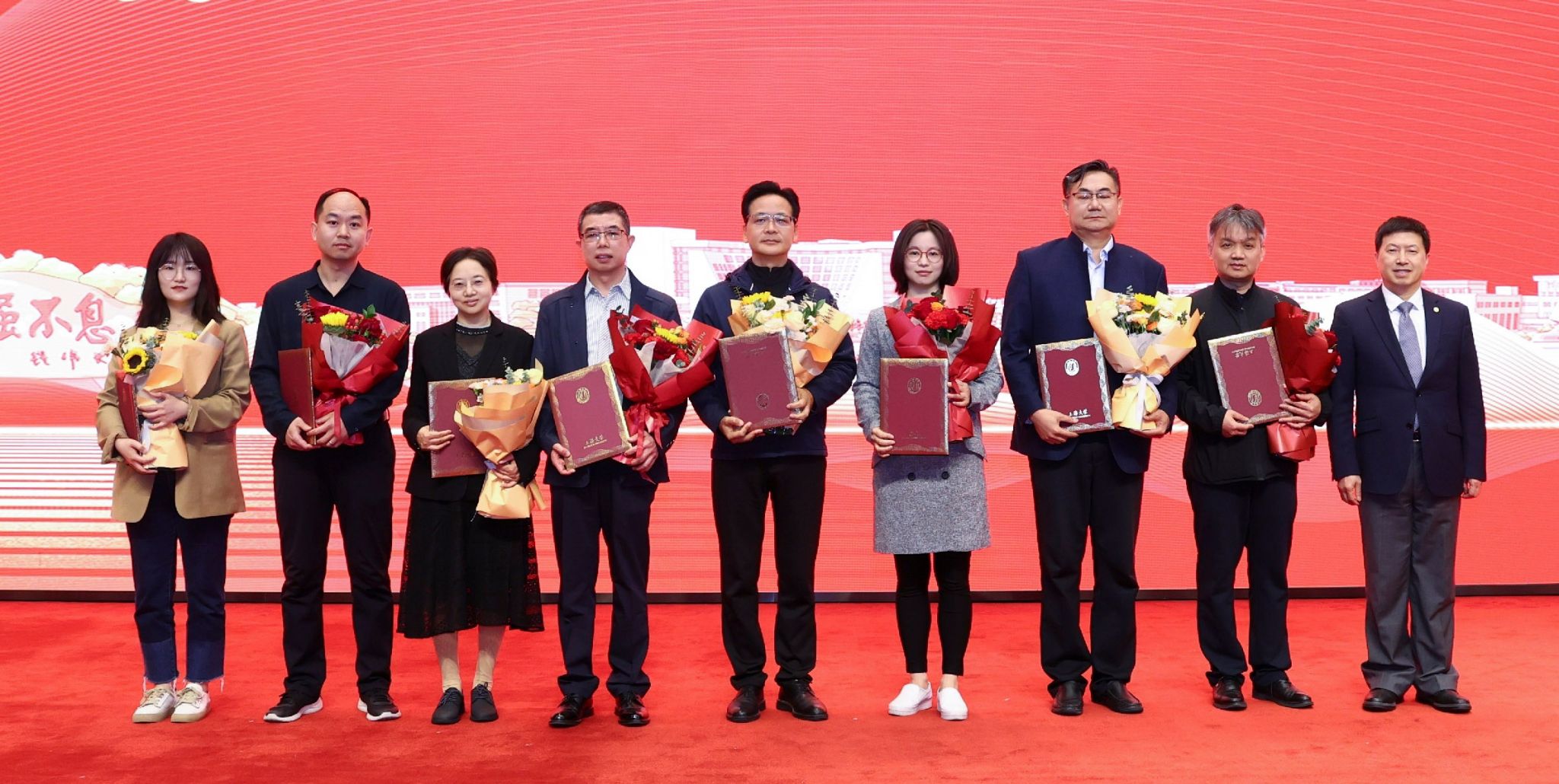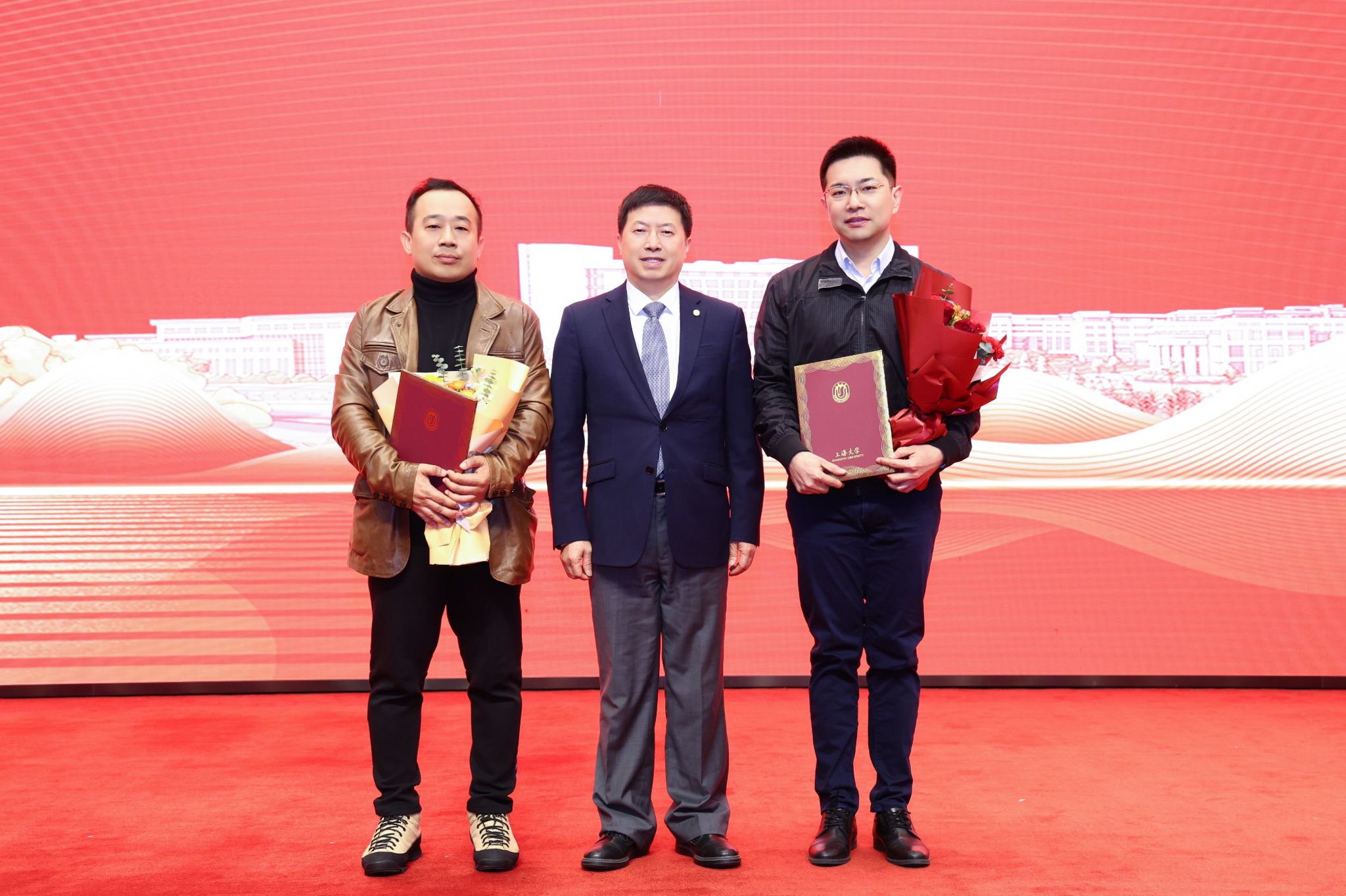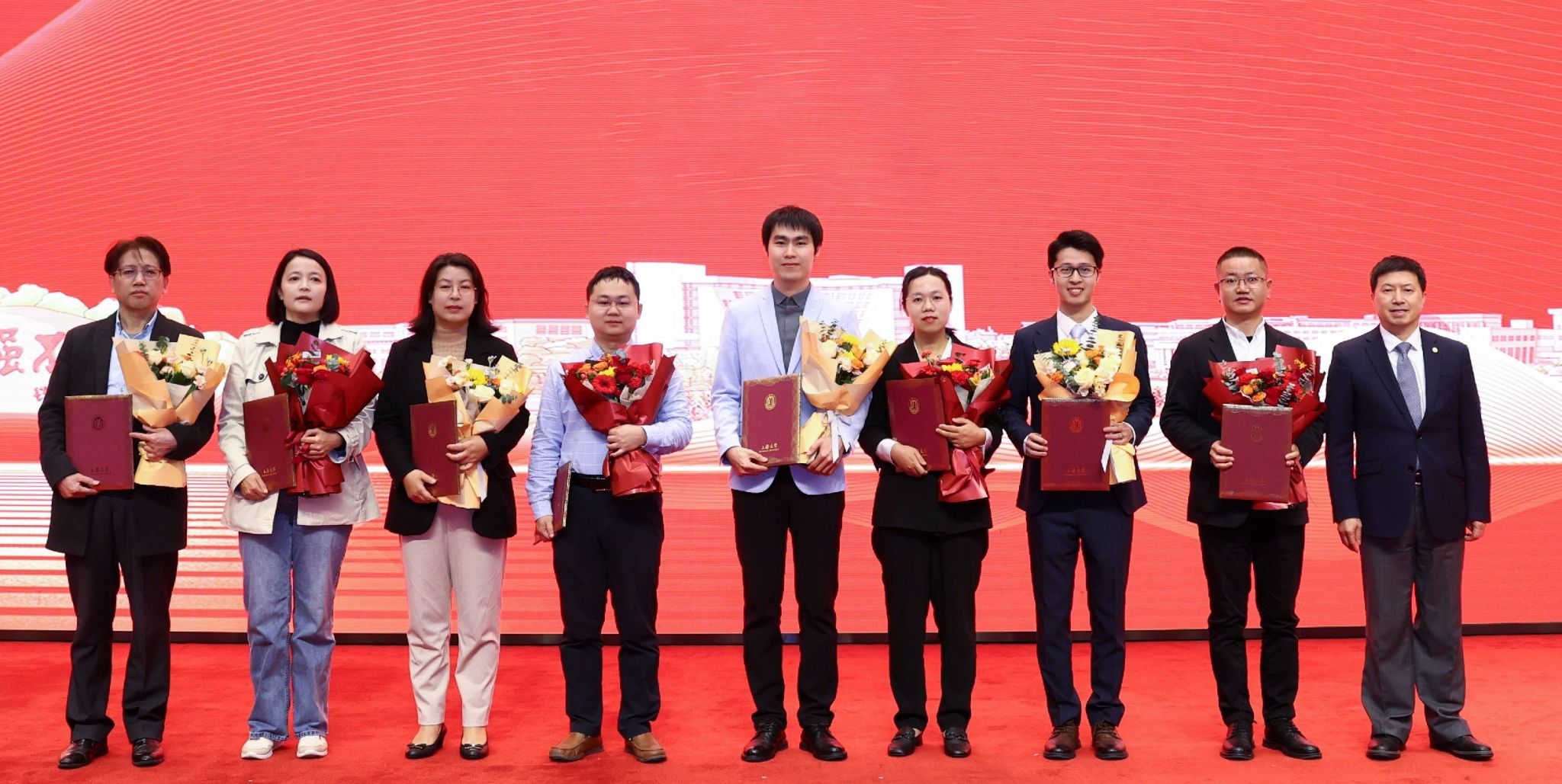 刘昌胜为2024年“伟长学者”颁发证书,优秀学生代表为他们献花。