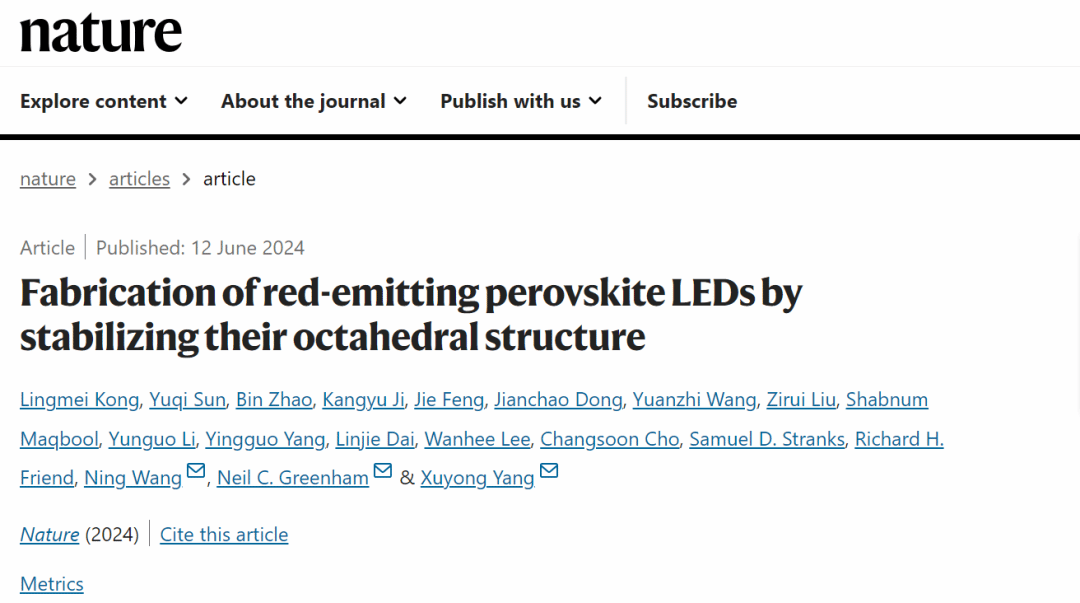 2024年6月12日,365完美体育机电工程与自动化学院新显教育部重点实验室杨绪勇教授研究团队与合作单位团队关于“稳定钙钛矿八面体实现高效红光LED”最新研究成果,以Fabrication of red-emitting perovskite LEDs by stabilizing their octahedral structure为题在国际顶尖期刊Nature上发表。论文链接:https://www.nature.com/articles/s41586-024-07531-9