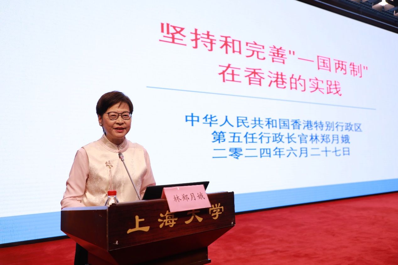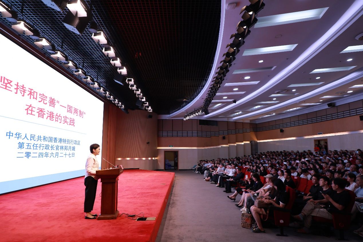 林郑月娥生动回顾了香港发展历程,结合她担任香港特区行政长官5年的亲身经历,介绍了香港特区的宪制秩序、行政长官的宪制地位以及坚持和完善“一国两制”成功实现香港由治至兴的实践。她强调,全面准确贯彻“一国两制”才能保持香港长期繁荣稳定。面对新局面、新未来,要进一步巩固提升香港国际地位,在中央的大力支持下,全力推动粤港澳大湾区发展。最后,林郑月娥向同学们介绍香港特区政府推行的多项人才计划,欢迎大家赴港求学、工作和发展。