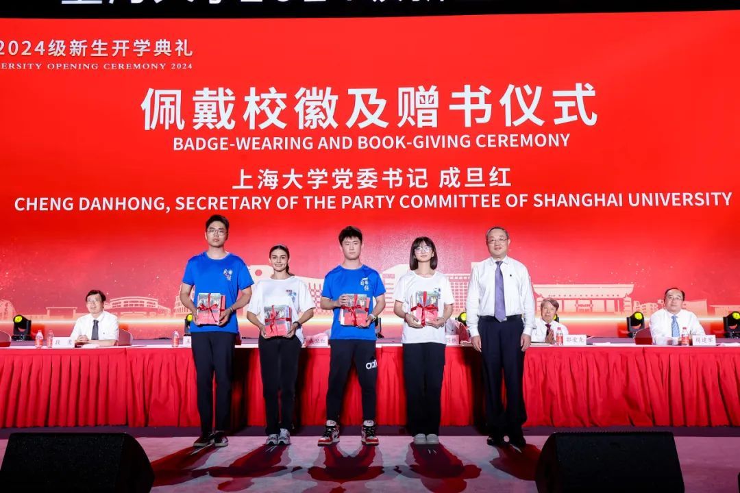 校党委书记成旦红为本科生、研究生、国际生新生代表佩戴校徽并赠送《习近平与大学生朋友们》《百年上大画传》《光荣之城:上海红色纪念地100》《AIGC未来已来迈向通用人工智能时代》等书籍。
