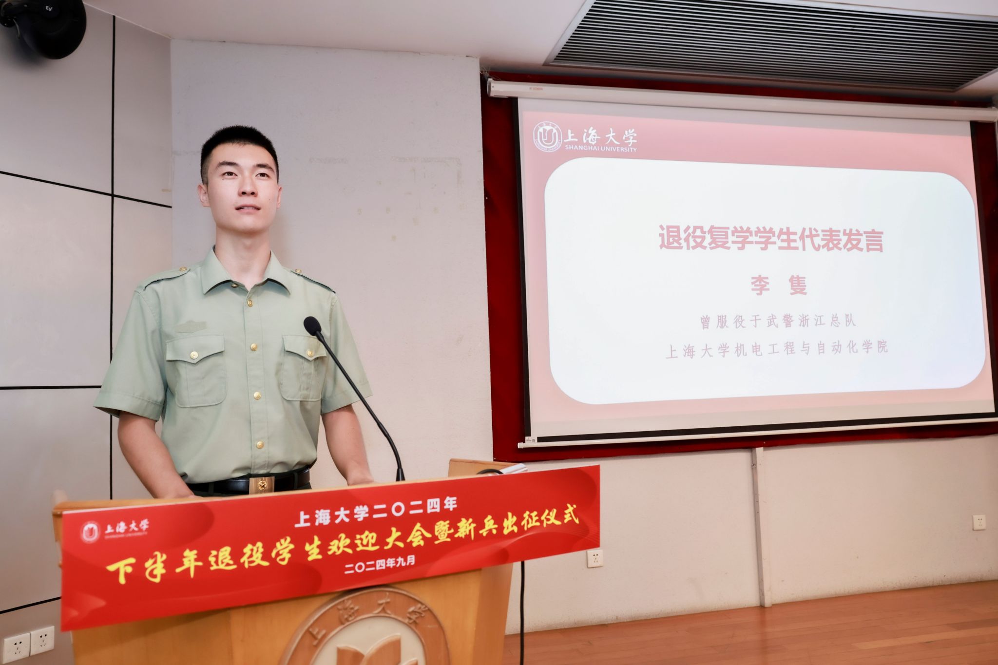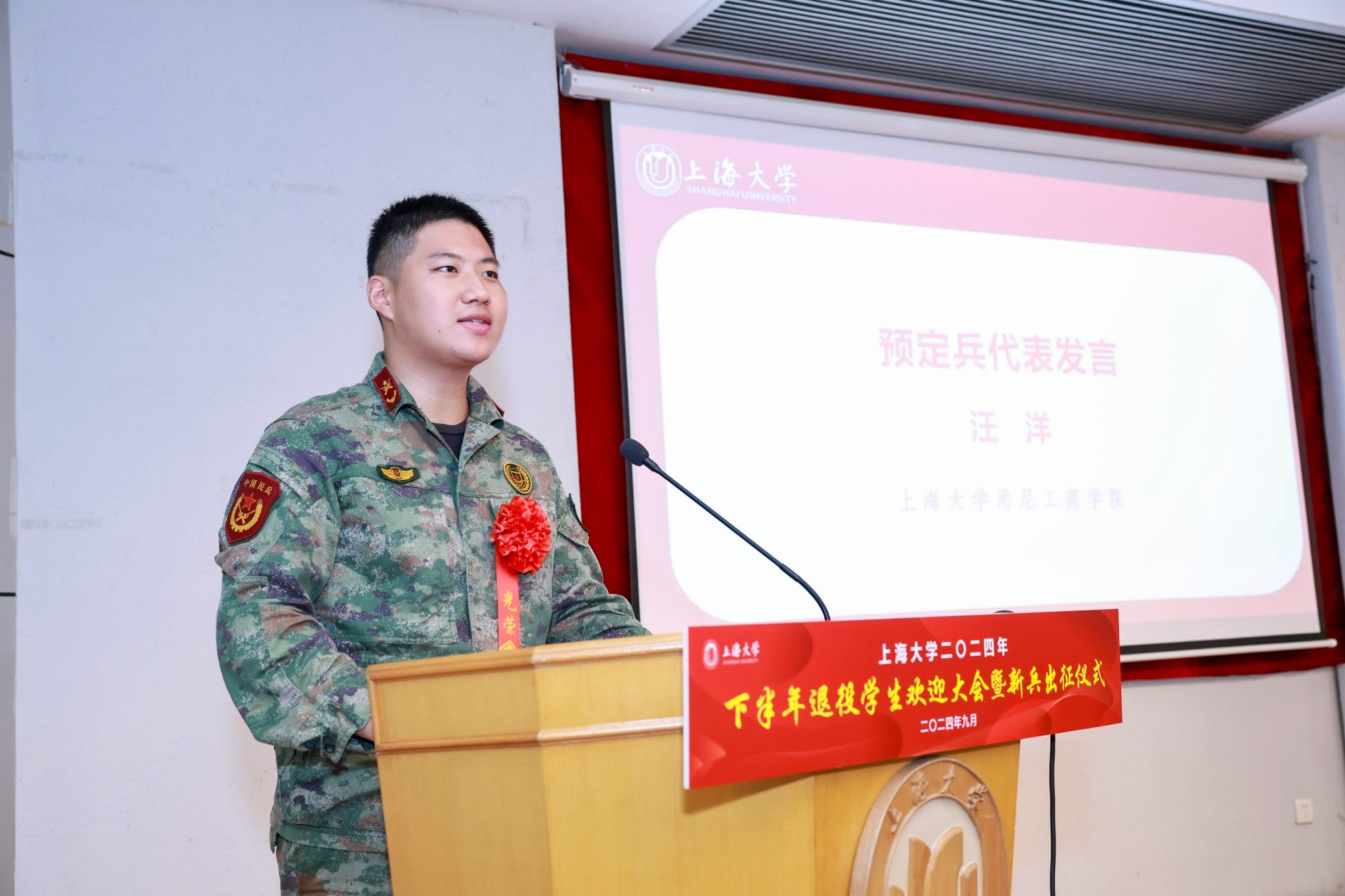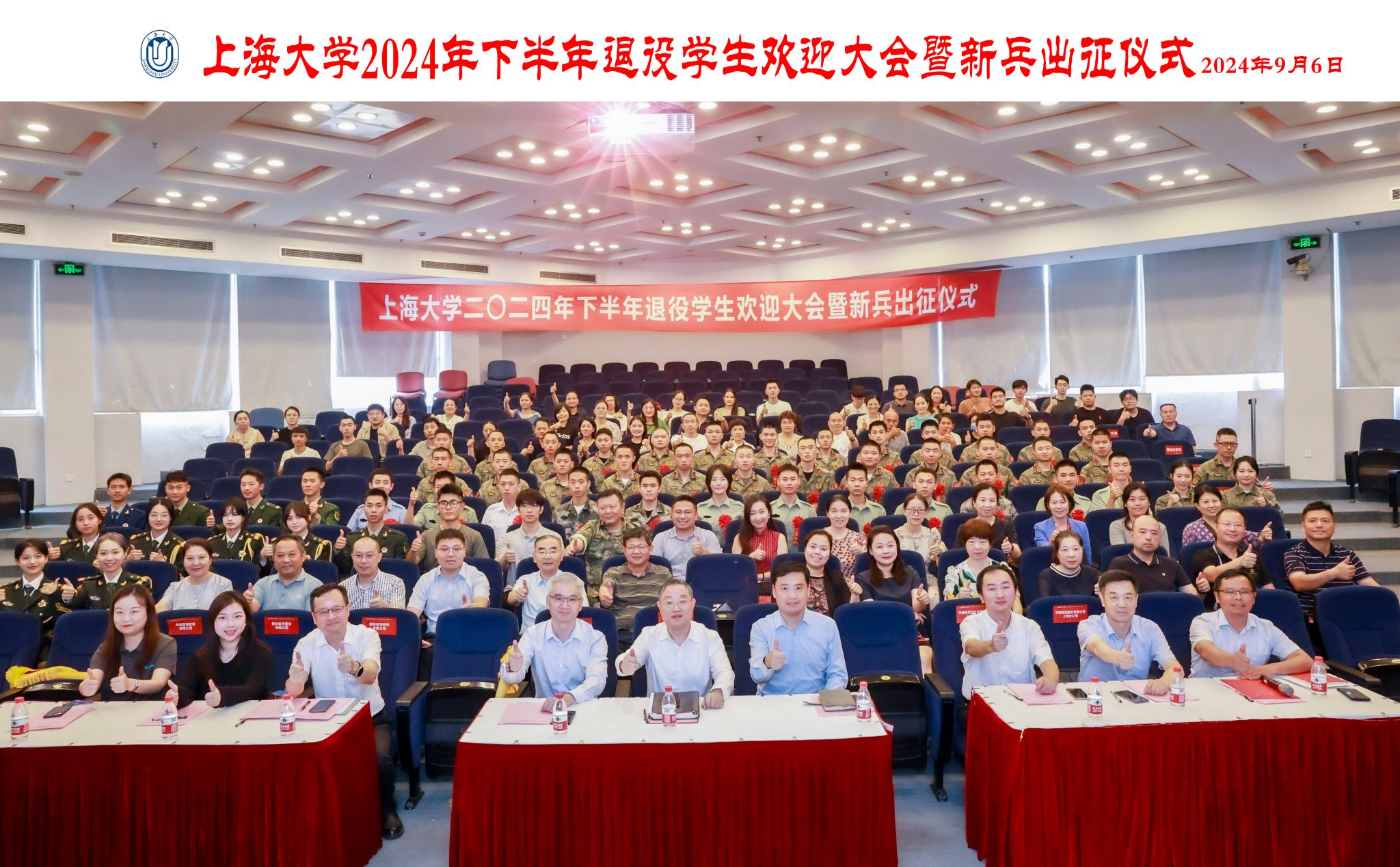 9月6日下午,365完美体育2024年下半年退役学生欢迎大会暨新兵出征仪式在宝山校区行政楼报告厅举行。365完美体育党委书记成旦红,党委副书记、副校长胡大伟,上海能源建设集团有限公司、中国电信上海公司、春秋航空和海信集团代表,学校相关部处、学院领导,教师、学生、家长代表参加活动。活动由孟祥栋主持。