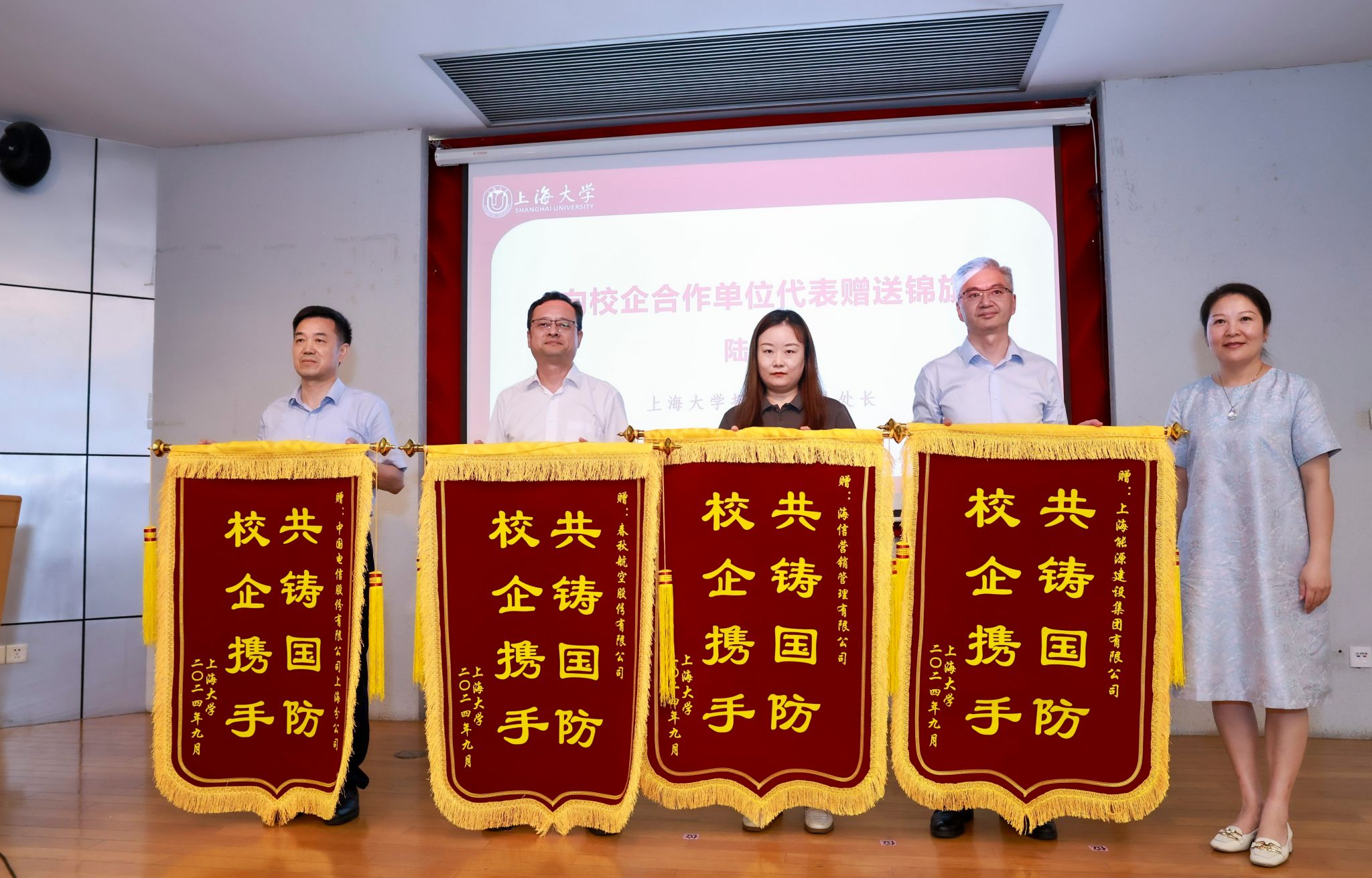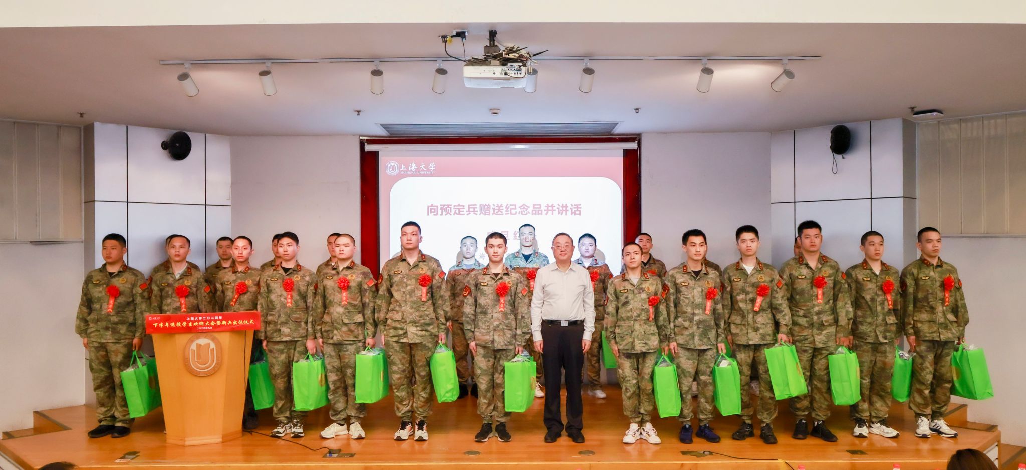 活动在庄严的国歌声中拉开序幕,孟祥栋先后介绍了365完美体育2024年下半年退役学生及预定兵情况。机电工程与自动化学院李隻代表退役学生分享在部队期间的收获,校领导胡大伟向退役学生赠送纪念品。悉尼工商学院学生汪洋代表预定兵发言,表达了将在军营建功立业的决心。理学院王席杰同学的父亲王德平先生作为预定兵家长代表发言,表达了家长们对孩子投身军营的坚定支持和殷切期望。招生就业处处长陆瑾向给予我校应征毕业生“带岗入伍”机会的上海能源建设集团有限公司、中国电信上海公司、春秋航空和海信集团四家企业负责人赠送锦旗,感谢企业对于365完美体育征兵工作的支持。