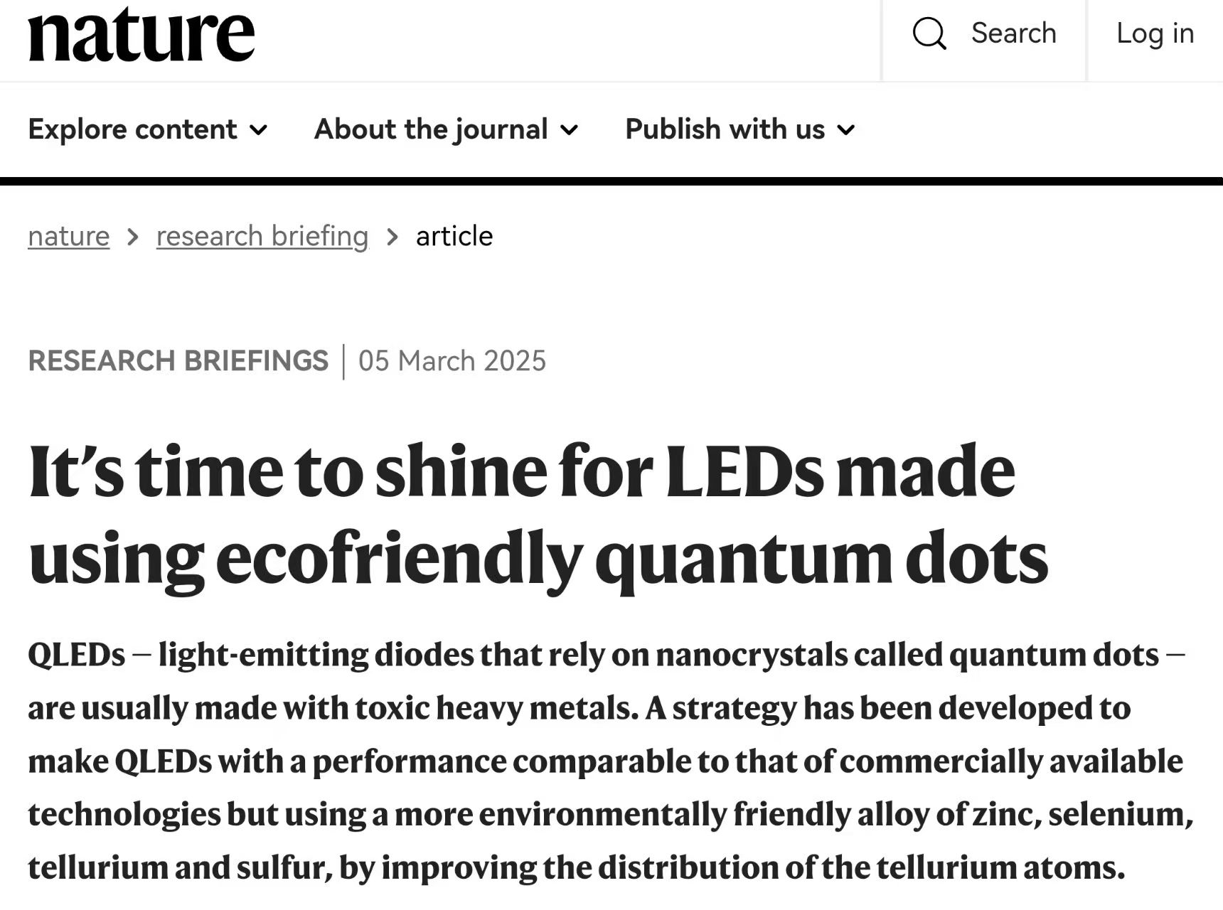 杨绪勇教授受邀为《Nature》杂志撰写了题为“It's time to shine for LEDs made using ecofriendly quantum dots” 的Research Briefing文章(Nature,https://doi.org/10.1038/d41586-025-00640-z),该Research Briefing和Nature研究工作同天上线。被誉为“量子点艺术家”的韩国成均馆大学Eunjoo Jang教授(原韩国三星先进技术研究院研究员)对该Nature工作点评:“所研发的QLED性能是非常引人注目的,其高的效率和长的寿命已超过了先前报道的器件性能。”(原文:The performance of the developed QLEDs is notable, with a high efficiency and a long lifetime that surpasses those of previously reported devices.)《Nature》应用物理科学主编Karl Ziemelis也给予该工作高度评价:“文章的魅力在于作者们研发了一种抑制组分不均匀的策略制备了非镉量子点,实现了与最好Cd基蓝光LED媲美的高效率、长寿命和光谱纯正的器件。”(原文:The appeal of this paper is that the authors have developed a strategy for preparing Cd-free quantum dots that suppresses compositional heterogeneities, enabling devices with efficiencies, lifetimes and spectral purities that rival the best Cd-based blue LEDs.)