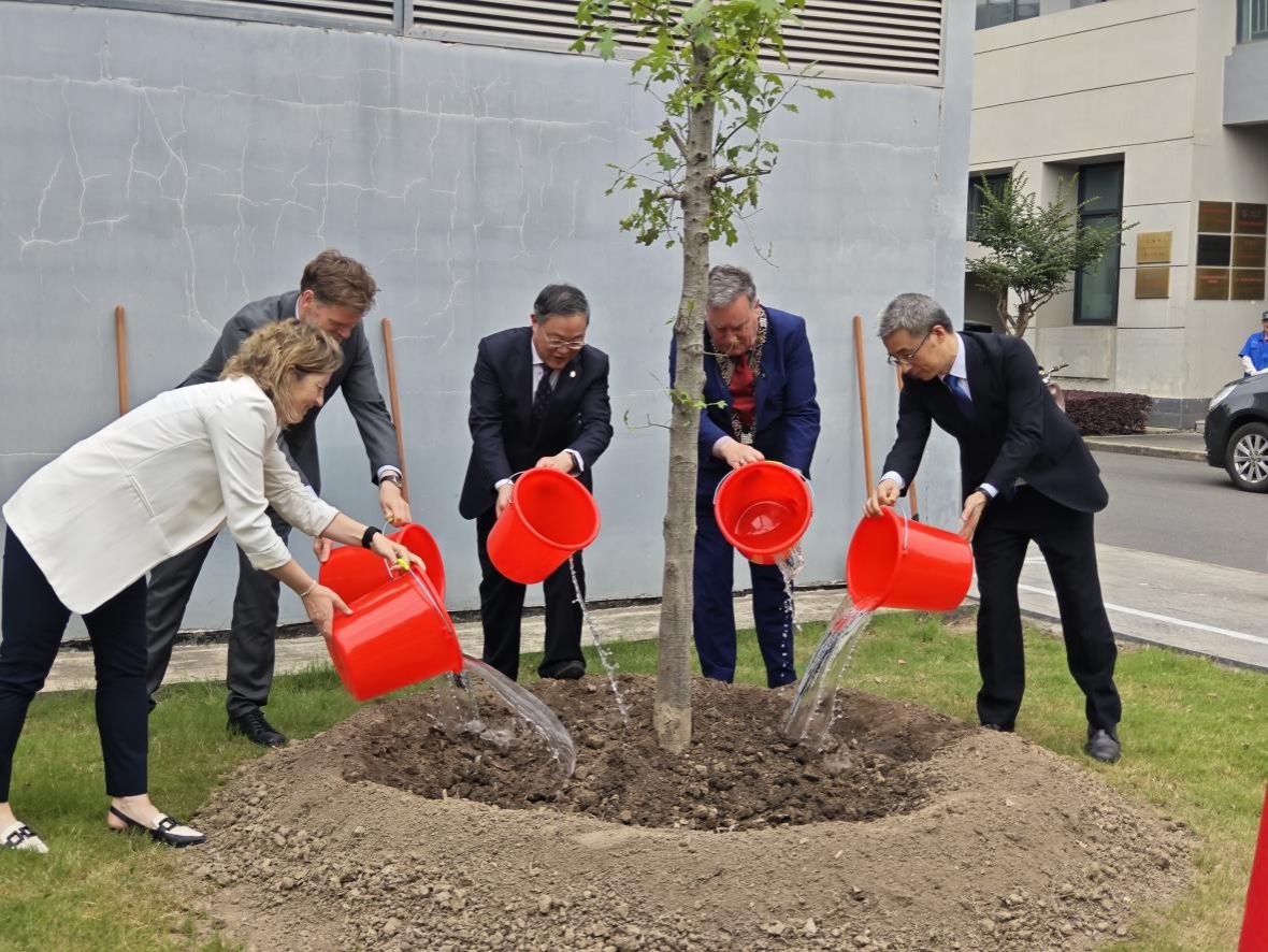 会谈结束后,中爱双方举行了上海-科克友好城市结好20周年纪念树种植仪式。