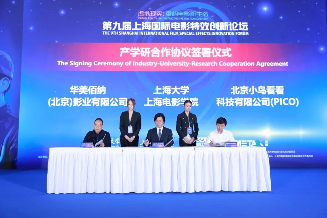 随后,在与会领导、嘉宾的见证下,学院与华美佰纳(北京)影业有限公司、北京小鸟看看科技有限公司(PICO)签署了产学研合作协议。