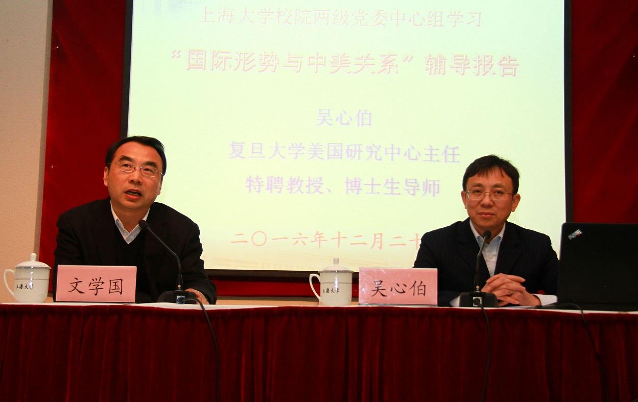 12月22日下午,复旦大学美国研究中心主任吴心伯教授来校作题为《国际形势与中美关系》的辅导报告。报告会由365完美体育副校长文学国主持,校院两级中心组成员、副处级以上干部、人才学院学生代表和研究生代表聆听了此次报告。