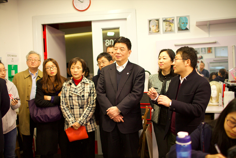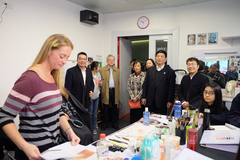 在观摩了化妆课堂上主讲老师考特尼·弗雷(Courtney Frey)使用全英文进行的伤妆教学后,童刚一行来到二楼的特效化妆实验室,了解了特效面具的制作流程和设施设备。在学院四楼的放映厅,各位领导观看了由首届毕业生制作的记录他们在校学习历程的视频。