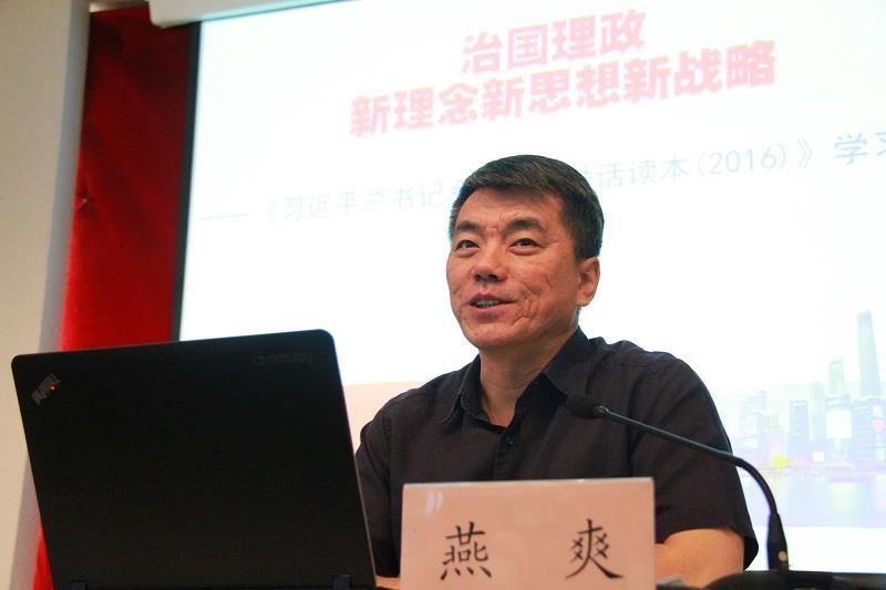 燕教授从《习近平总书记系列重要讲话读本(2016年版)》的背景、特点、结构和要点四个方面深入解读了习总书记的讲话读本。他指出,习近平总书记的治国理政新理念是“创新、协调、绿色、开放、共享”的五大发展理念;新战略是全面建成小康社会、全面深化改革、全面依法治国、全面从严治党的战略布局。燕教授还指出,新版的讲话读本是习总书记两年来讲话内容的增补,为党的十九大提供了思想理论准备,更是围绕着习近平总书记治国理政提出的一系列新理念、新思想、新战略而设计的。其次,他指出新版读本的特点是权威性强、信息量大、评价定位新、指导作用强。随后,他深入解读了新版读本的结构,从中国梦、中国道路、战略布局、总体布局、环境保障几个方面进行了深入解读,指出新版读本做了结构新调整,主题新表述,是我们的行动新纲领。最后,他指出,新版读本的要点也是习近平总书记的重大思想部署,提出了治国理政总方略、五大新发展理念、经济发展新常态、总体国家安全观、合作共赢的新型国际关系和人类命运共同体等新理念新思想新战略。