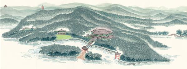 《西湖景色》是一件5米×2米的大型设色水墨杰作,描绘了西子湖的湖光山色美如天堂仙境,带有浓郁的中华文化韵味,汪庄这栋传奇的中国古典庄园在画面中心被层叠的群峰环衬着。