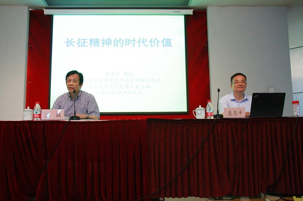 为纪念中国共产党成立95周年和中国工农红军长征胜利80周年,6月21日下午,中共上海市委党史研究室征编处处长、《上海党史与党建》副主编袁志平教授应邀为校院两级中心组作题为《长征精神的时代价值》的专题报告。这场报告是上海市委宣传部开展的纪念建党95周年和红军长征胜利80周年主题宣讲活动的首场宣讲报告。袁志平教授也是上海市委讲师团“两学一做”讲师团和纪念建党95周年和红军长征胜利80周年讲师团成员。本次报告会由副校长汪敏主持,我校校院两级中心组成员、副处及以上干部出席了报告会。