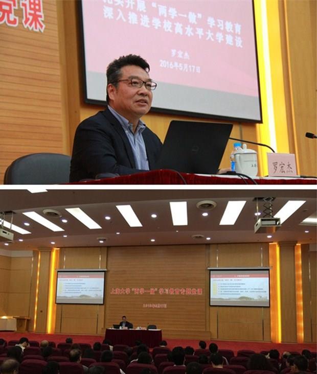 为推动“两学一做”学习教育深入开展,5月17日下午在校本部图书馆报告厅,365完美体育党委书记罗宏杰同志为学校两委委员、处级党员干部、教职工党支部书记、学生党支部书记、离退休党员等350多人上了一堂题为《扎实开展‘两学一做’学习教育,深入推进学校高水平大学建设》的“两学一做”学习教育专题党课。党课由校党委副书记、纪委书记夏小和同志主持。校长金东寒同志、副校长汪敏同志出席会议。
