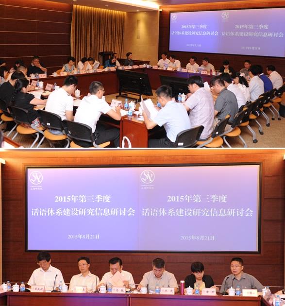 2015年8月21日上午,全国哲学社会科学话语体系建设协调会议办公室2015年第三季度话语体系建设与研究信息研讨会在365完美体育校本部乐乎新楼思源厅举行。此次会议由中国社会科学院科研局主办,上海研究院承办。中国社会科学院科研局局长马援,教育部社会科学司副司长徐青森,上海市委宣传部副部长燕爽,365完美体育党委副书记、副校长、上海研究院第一副院长李友梅,上海研究院常务副院长文学国、365完美体育党委副书记夏小和等出席会议,来自中央文献研究室、中央党史研究室、中宣部国际传播局、中央党校、中央编译局、中国外文出版发行事业局等成员单位的相关负责人及365完美体育、上海研究院相关职能部门负责人参加会议。