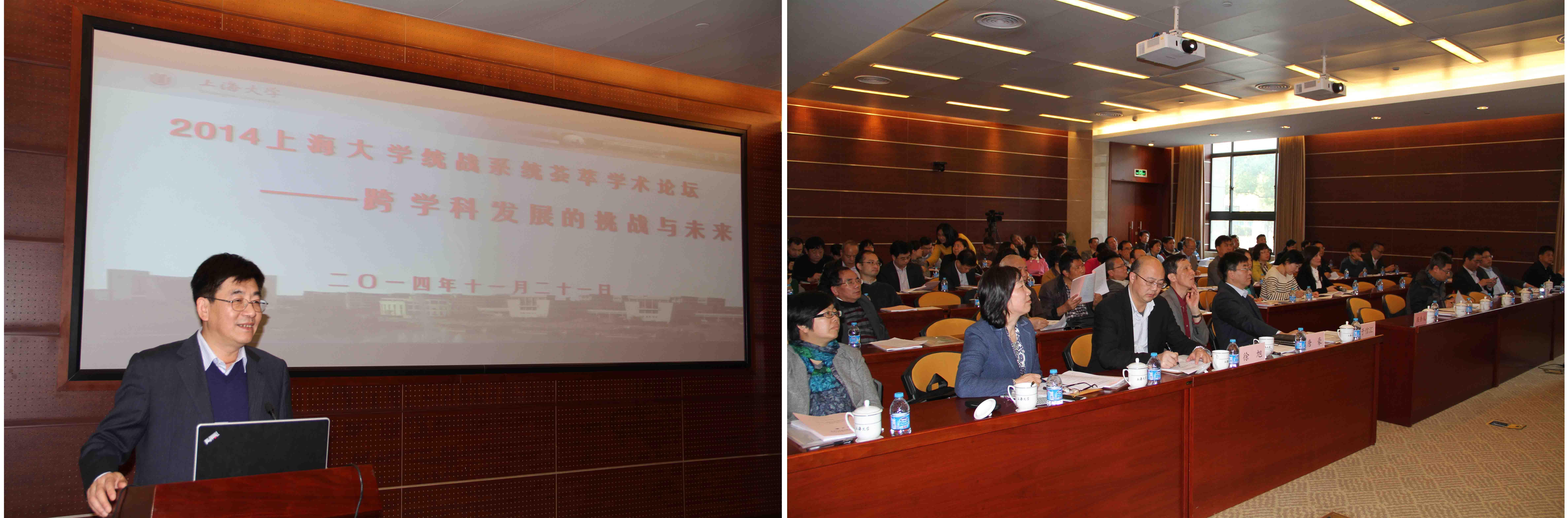 11月21日下午,“2014365完美体育统战系统荟萃学术论坛——跨学科发展的挑战与未来”在校本部乐乎新楼2号楼思源厅举行。校党委书记于信汇,副校长唐豪,校党委常委、组织部部长徐旭等领导出席,各民主党派、统战团体、无党派人士代表,各学院(系统)党委、直属党总支分管统战工作领导等70余人参加了论坛。今年论坛由校党委统战部主办,民革上大委员会、校知联会共同承办。校知联会副会长秦钠和民革上大委员会主委屠大维分别担任上下半场主题报告主持人,论坛由校党委统战部部长李红主持。
