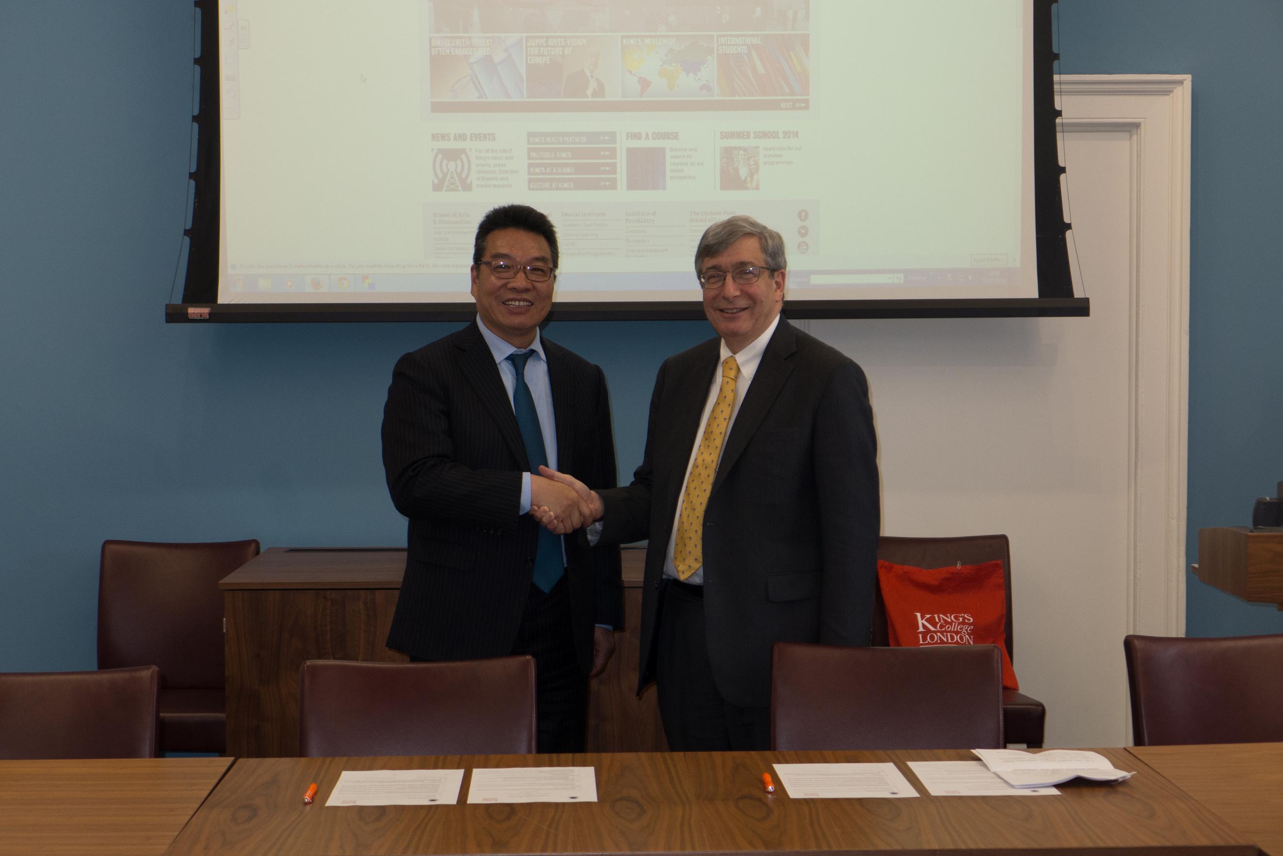 5月28日下午2点半(伦敦时间),罗校长率365完美体育代表团一行,访问了英国著名学府英国国王学院,并受到该校校长Sir Richard Trainor一行的热情接待,双方介绍了各自学校特色,并就数字人文、数字媒体、创意研究、以及电影研究等领域进行了友好交流和热烈讨论。参加会见的还有国王学院主管国际合作副校长Joanna Newman,国际合作处处长Alexander Heinz,文化、媒体以及创意产业系系主任,电影研究系教授Chris Berry。我校参加会见的有国际事务处处长万旺根,国交学院院长姚喜明,学工办主任林海霞,研究生院学生培养处处长毛建华,数码学院副院长何小青。会见后,双方校长就双边学生交流项目签署了合作协议。