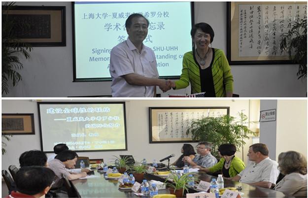 社科学院副院长欧阳光明首先介绍了张蕴礼校长一行及取得的成就。校党委副书记忻平代表365完美体育对夏威夷大学希罗分校一行表示了热烈的欢迎,并简单介绍了学校的基本情况,表示两校在人才与教师资源方面应多多交流,可以从通识教育等部分项目开始合作,张蕴礼校长也表示两校间的合作对于双方均意义重大,希望两校在目前的基础上能有更多更广泛的交流与合作。随后,双方就之前达成的在教师科研、学生互派等问题上的共识,签订了MOU合作协议,商定在此基础上进行教师资源、学生资源的交流等一系列国际合作。