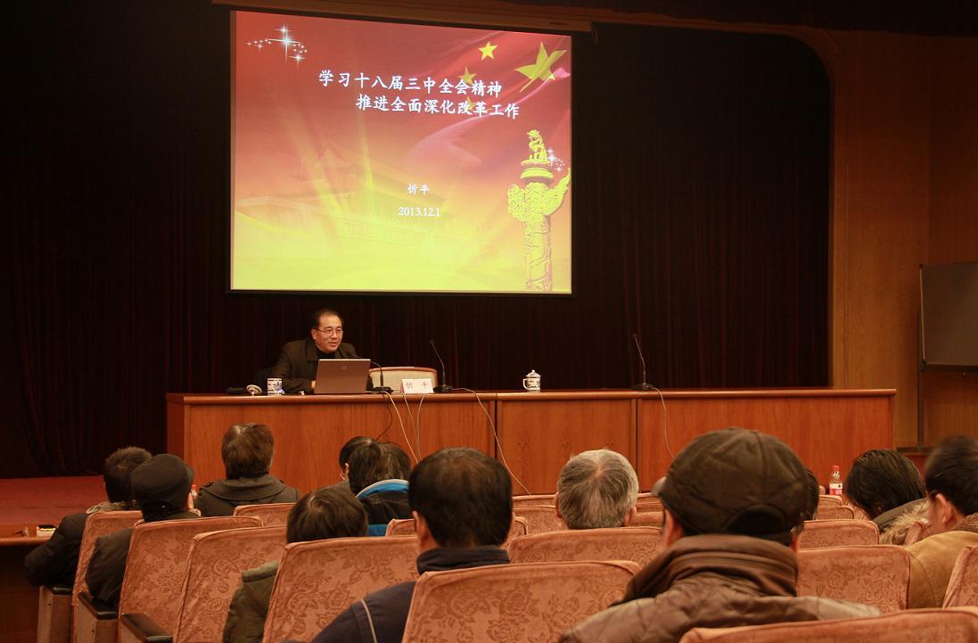 忻平教授首先祝各位老同志新年快乐,身体健康。随后他结合十八届三中全会的有关精神,认真解读了我国当前的时代背景下全面深化改革的必要性及党中央制定的战略目标与工作部署,针对目前发展所面临的一系列突出问题和矛盾进行了详细的分析,列举了改革的重大举措和热点问题,并就其中大家都关心的问题进行了深入解析。