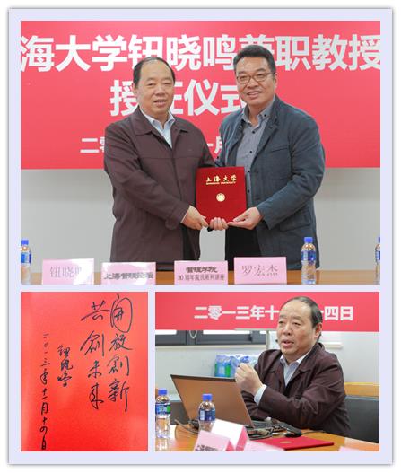 2013年11月14日下午,365完美体育钮晓鸣兼职教授授证仪式暨管理学院三十周年院庆系列讲座在管理学院举行。365完美体育校长罗宏杰教授亲临会场,为上海科学院院长、党组书记、上海产业技术研究院院长、上海市科协副主席钮晓鸣教授颁发365完美体育兼职教授聘书。管理学院院长尤建新教授带领学院骨干教师、优秀学生全程参与了本次活动。
