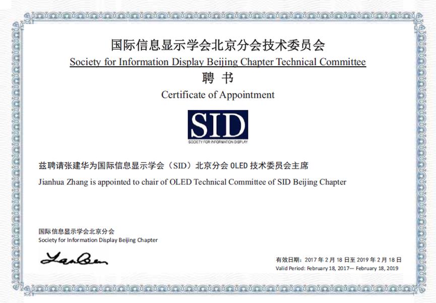 我校新型显示技术及应用集成教育部重点实验室主任张建华教授当选为国际信息显示学会(SID)北京分会OLED技术委员会主席。