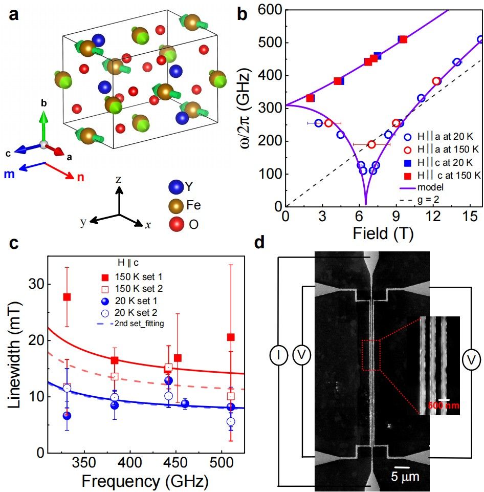 图1. 晶体结构、磁共振及器件。(a) YFeO3[010]的晶体结构。(b) 在两种不同的温度下,共振频率作为沿a轴(空心符号)和c轴(实心符号)磁场的函数,蓝色为20 K,红色为150 K。(c) 在20 K和150 K时,磁场沿c轴线宽与频率的函数关系。(d) 典型器件的扫描电镜图像,其中电流沿着中间导线驱动,并在其左右的两根导线中测量非局域电压。