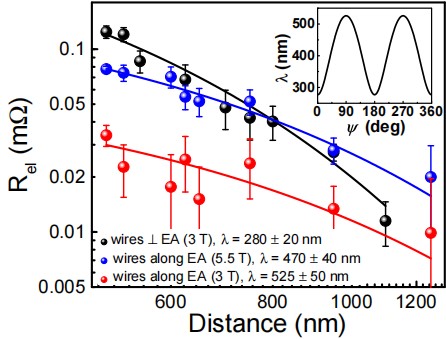 研究发现,平行易轴与垂直于易轴的自旋输运信号响应表明可以通过施加磁场调整奈尔矢量的方向来寻找非局域电阻的最大值,自旋信息的输运仅由奈尔矢量介导(图2)。YFeO3中磁振子衰变长度的测量证实了在超低阻尼正铁氧体YFeO3中数百纳米的磁振子传输,其传输机制是由Dzyaloshinskii-Moriya相互作用和外加磁场共同促成的。磁振子衰减长度超过数百纳米,与共振测量相一致。经过详细理论分析,确定磁振子群速度的各向异性是观察到各向异性磁振子衰减长度(λ)的主要机制(图3)。在YFeO3中发现的这种独特的传输模式为一大类与技术相关的材料,比如倾角反铁磁正铁氧体,提供了长程自旋传输的可能。此外,通过长程非局域输运测量和反铁磁共振测量所观察到的输运模式突出了低阻尼反铁磁绝缘体在集成到下一代磁电子和自旋电子器件中的应用潜力,是朝着建立反铁磁绝缘体中长程自旋输运通用模型最终目标迈出的重要一步。