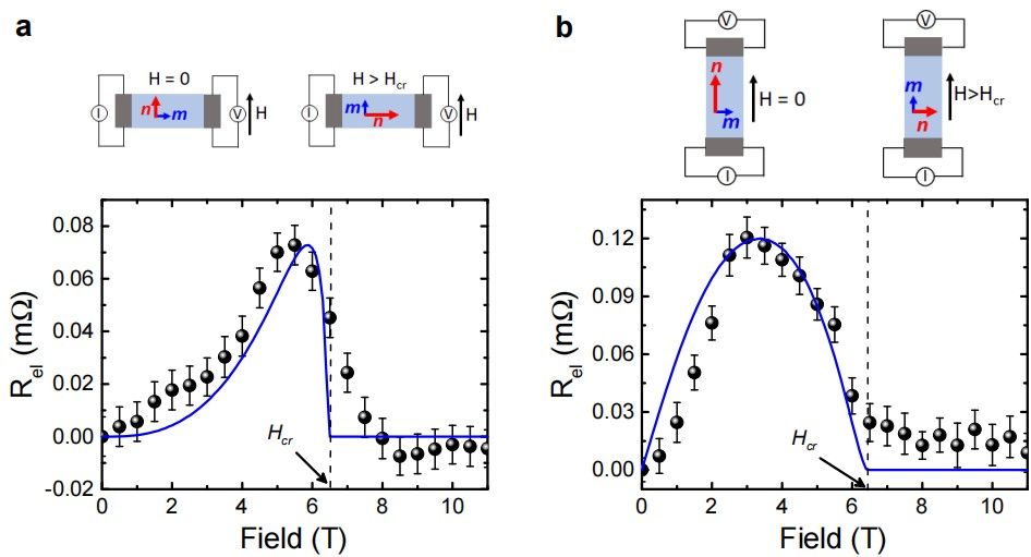 图2. 200 K温度下YFeO3中的自旋输运。(a) 当磁场沿着单晶易轴(a轴)与铂丝方向平行时,非局域电阻与磁场强度的关系。(b) 当磁场沿着单晶易轴(a轴)与铂丝方向垂直时,非局域电阻与磁场强度的关系。