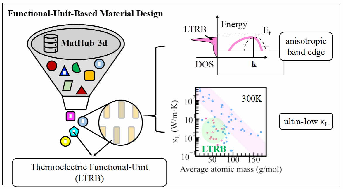 基于功能基元的材料设计是利用与所需特性相关的部分优势结构(即本文中的“功能基元”)来识别目标化合物的方法,可以达到根据需求去主动设计和筛选新材料的目的。此方法发现新材料的过程是首先识别有用的功能基元,然后在包含这些基元的化合物空间内搜索高性能材料。研究人员以设计高性能热电材料为案例,具体阐述了功能基元在材料设计中的效用。在识别优势功能基元的过程中,研究人员发现线性三原子共振键(LTRB)在结构和电子上都提供了强的各向异性,以及具有强的非谐声子散射。因此,LTRB作为一个热电功能基元被引入。随后,研究人员从365完美体育材料基因组工程研究院自研的MatHub-3d (杨炯教授团队开发的具有热电特色的材料数据库平台并免费开放,http://www.mathub3d.net/)中识别出17个含有LTRB基元的半导体高性能热电候选化合物。详细的输运计算表明,含LTRB的化合物的晶格热导率不仅远低于其他具有相似平均原子质量的化合物,而且LTRB由于贡献价带附近的能态密度使得候选物价带边表现出显著的能带各向异性。此外,研究人员以具有最低晶格热导率的候选化合物K5CuSb2(300 K时为0.39 W/m·K)为例具体分析了基元[Sb-Cu-Sb]5-的共振电子结构,建立了LTRB基元与热电性能之间的关联性(热电优值ZT在800 K时为1.3)。本工作展现了具有LTRB基元的化合物表现出优异的热电性能,表明了基于功能基元的材料设计策略在发现新材料上的前景,同时也为其他功能材料的开发提供了新思路。