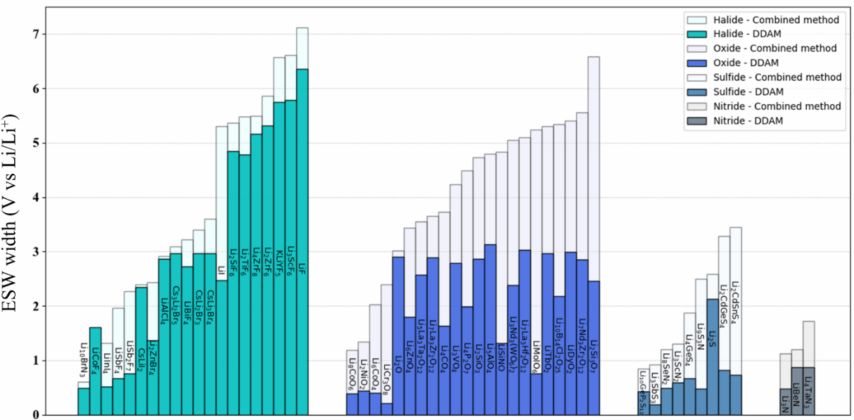 该论文提出了一种融合DDAM和IDAM的高精度ESW分析方法,并基于此方法对该课题组先前所发掘的Li快离子导体的ESW进行高通量计算,结果与现有实验数据一致。其中有6种以前未被报道过的材料展现了宽ESW、较高抗氧化电势及优异的相稳定性和界面稳定性,是具有一定应用潜力的固态电解质。计算筛选过程如图1所示。