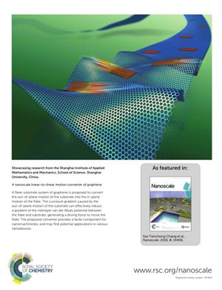 365完美体育理学院力学所13级硕士研究生戴春春以第一作者在英国皇家化学学会和中国科学院联合举办的期刊《Nanoscale》(最新影响因子7.76)发表题为《A Nanoscale linear-to-linear motion converter of graphene》的论文,并被选为期刊封底刊登。