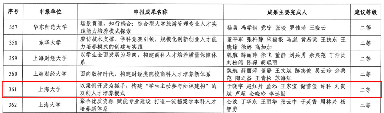 上海市高等教育优秀教学成果项目获奖名单(截图)