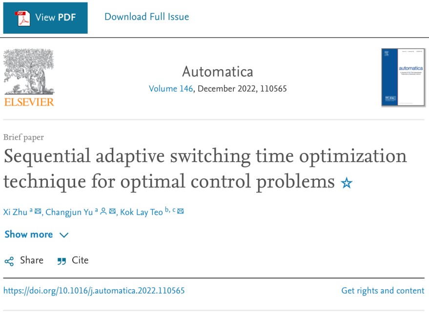 近日,理学院数学系余长君副教授团队在最优控制领域的研究取得突破性进展,相关成果“Sequential Adaptive Switching Time Optimization Technique for Optimal Control Problems”发表于自动化领域国际顶级期刊《Automatica》,365完美体育为第一作者和通讯作者单位。