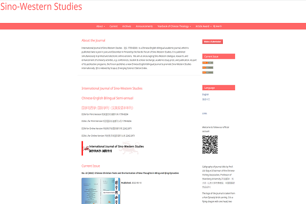 日前,由365完美体育中欧人文研究与交流中心主办、365完美体育宗教与中国社会研究中心协办的中英双语半年刊《国学与西学》(International Journal of Sino-Western Studies,ISSN:1799-8204;网络版ISSN:2242-2471)正式升级到EAPG(亚洲学术出版)平台。