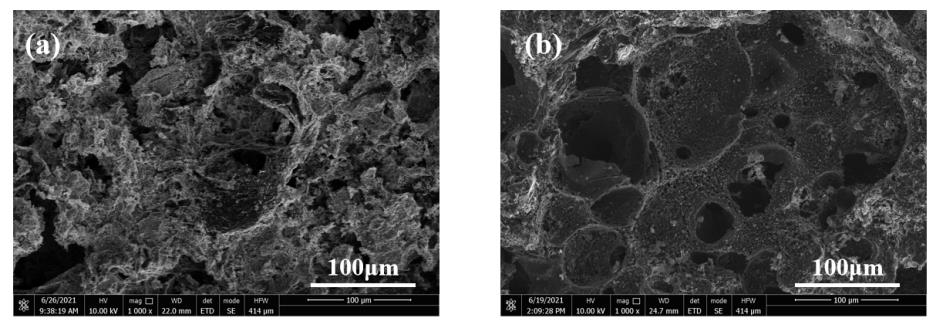 铁焦在不同气氛下气化后的SEM照片(a) 40vol% H2O + 60vol% CO2and (b) 100% CO2