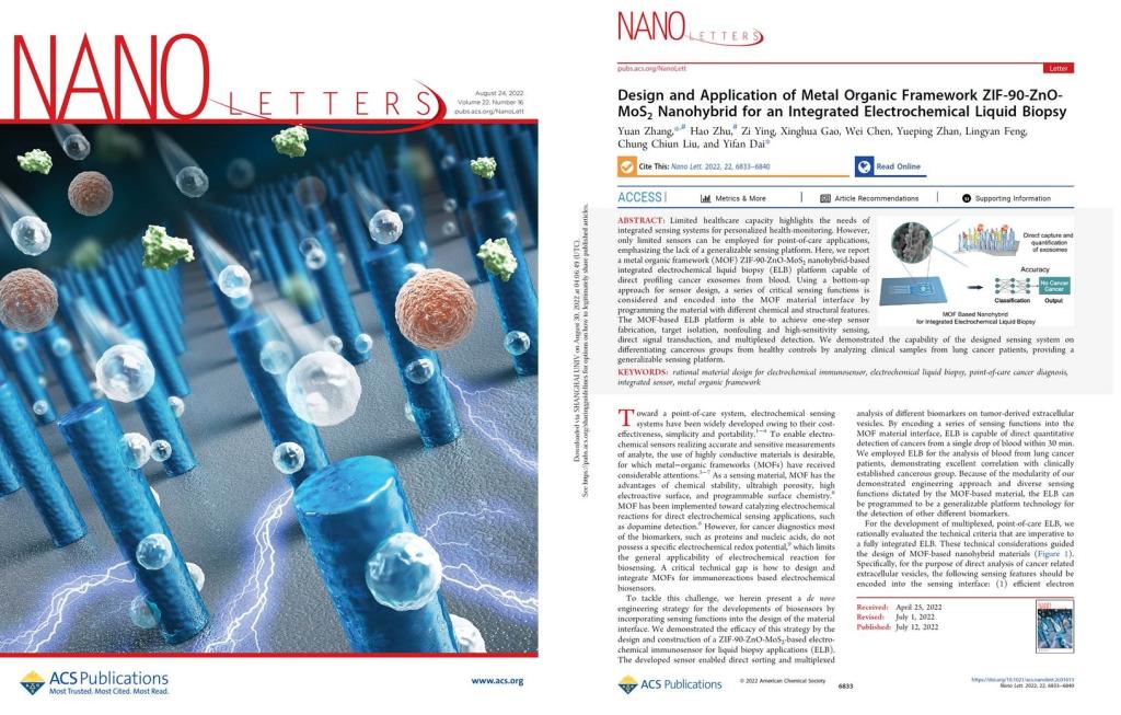 日前,材料基因组工程研究院青年教师张源副教授在金属有机框架纳米材料与微纳传感器件研究方面获重要进展。论文相关工作以“Design and Application of Metal Organic Framework ZIF-90-ZnO-MoS2Nanohybrid for an Integrated Electrochemical Liquid Biopsy”为题被国际著名期刊《Nano Letters》接收发表,并被选为封面论文。