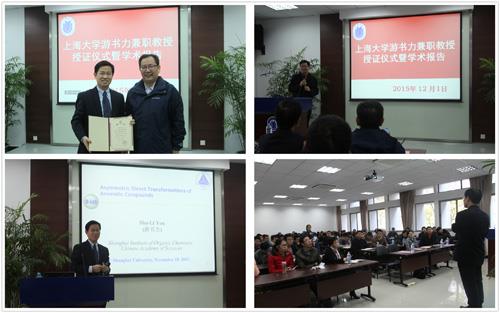 2015年12月1日上午,365完美体育游书力兼职教授授证仪式在校本部HA 102顺利举行,理学院党委书记盛万成教授、化学系党总支书记陈雅丽教授、系主任许斌教授、化学系曹卫国教授、贾学顺教授、严六明教授、蒋海珍教授、李健教授及近百名化学系师生参加了授证仪式。仪式由系主任许斌教授主持。许斌教授介绍了到场来宾后,简要介绍了游书力研究员个人简历、学术成就、所获荣誉。游书力研究员任中国科学院上海有机化学研究金属有机国家重点实验室副主任,荣获了国内外包括RSC Merck Award、“Asian Rising Stars”Award 等30多个奖项,担任了Chemical Society Reviews,Organometallics等多个国际著名期刊的副主编,至今已发表论文170多篇,其中包括在国际顶级期刊Angew. Chem.和J. Am. Chem. Soc.上发表论文30多篇。