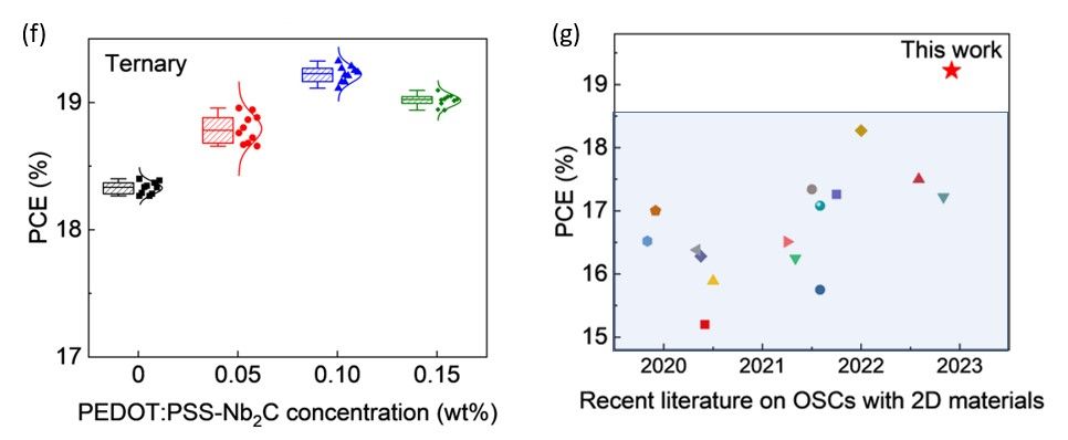图2.(a)Nb2CMXene的TEM图.(b)Nb2CMXene的高分辨率TEM图(嵌图为SAED选区电子衍射图).(c)PEDOT:PSS-Nb2C复合空穴传输层材料的高分辨TEM 图.(d)Nb2C促进PEDOT:PSS相分离的机理示意图.(e)基于PEDOT:PSS-Nb2C复合HTL的OSCs器件结构图.(f)三元OSCs的PCE随Nb2C掺杂浓度的性能分布图.(g)基于二维材料的单结OSCs性能比较图。