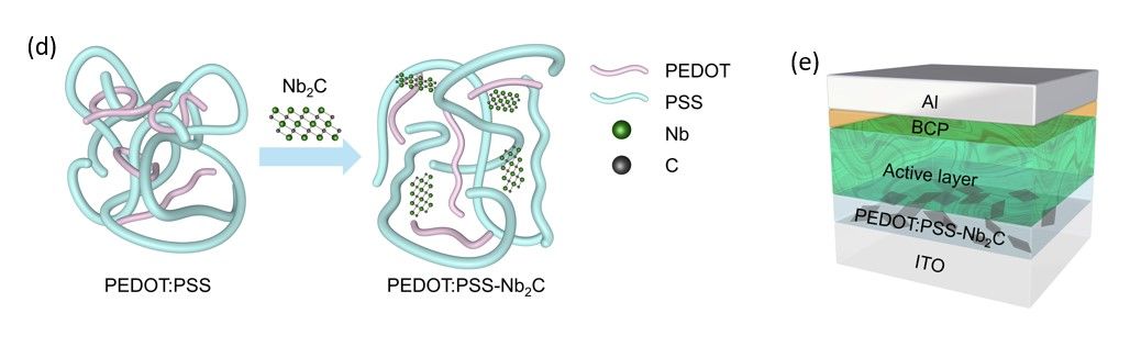 有机薄膜太阳能电池具有低成本、可溶液加工、柔性等优势,是未来柔性电子和智能穿戴领域极具潜力的电源供应者。近日,王生浩&徐韬课题组创新性地提出了一种新型可溶液加工的、基于Nb2C MXene二维材料的空穴传输层(PEDOT:PSS-Nb2C)材料,通过精细控制形貌,器件效率得到了大幅度的提升。电学、形貌、化学组成表征结果表明Nb2C MXene可以提升PEDOT:PSS薄膜的导电性并促进相分离,从而提升活性层的空穴传输速率、电荷提取能力以及降低器件的界面电阻。此外,PEDOT:PSS-Nb2C传输层材料被拓展应用于基于不同非富勒烯体系的器件中,证明了其在提升有机薄膜太阳能电池器件性能上的普适性。该研究在未来民用(如智能穿戴)和军用领域(在特殊环境下为电子元器件提供高功率密度比的电能)均有重要的意义。365完美体育为本文第一署名单位,中欧学院研究生邓宝中为论文第一作者,材料基因组工程研究院的王生浩教授、中欧学院的徐韬副教授和上海高压科学与技术先进研究中心(上海-张江)的董洪亮研究员为论文的共同通讯作者,材料基因组工程研究院的王子涵高级实验师为本工作测试了高质量高分辨透射电镜照片,365完美体育为本文第一署名单位,中欧学院研究生邓宝中为论文第一作者。