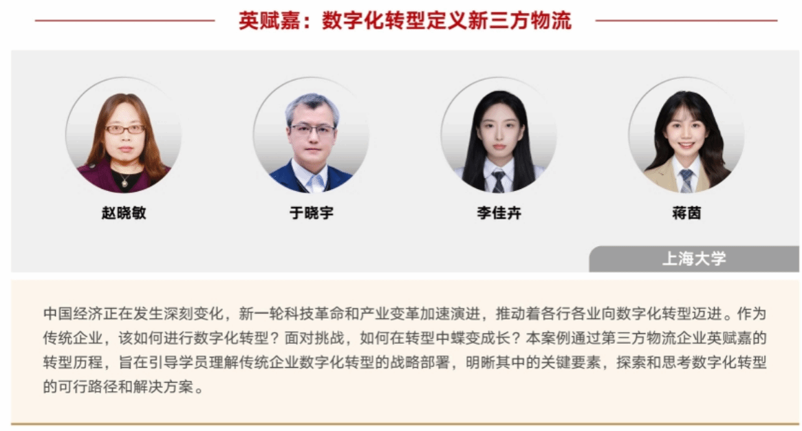 获奖案例《英赋嘉:数字化转型定义新三方物流》聚焦于传统企业数字化转型的时代背景,以全景方式再现第三方物流企业“英赋嘉”在科技驱动下向新三方物流转变的历程。案例解析了英赋嘉数字化转型的战略部署和实施路径,探讨了企业在向“基础物流服务叠加数智服务”的新三方物流转变过程中的挑战、以及应对措施和转型效果,启发管理者明晰数字化转型的关键要素,探索和思考传统企业在数字化转型中亟待解决的问题和可行方案。