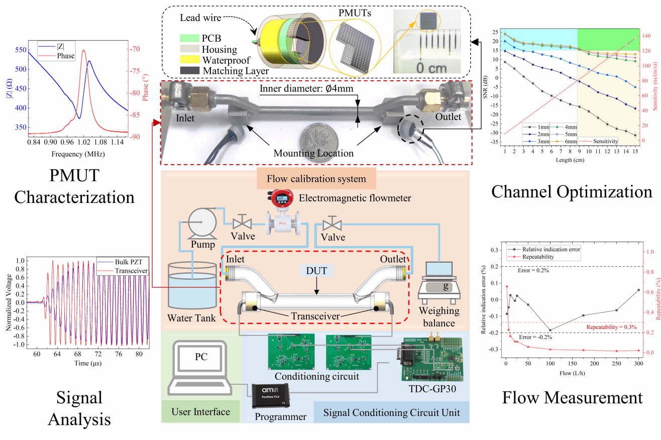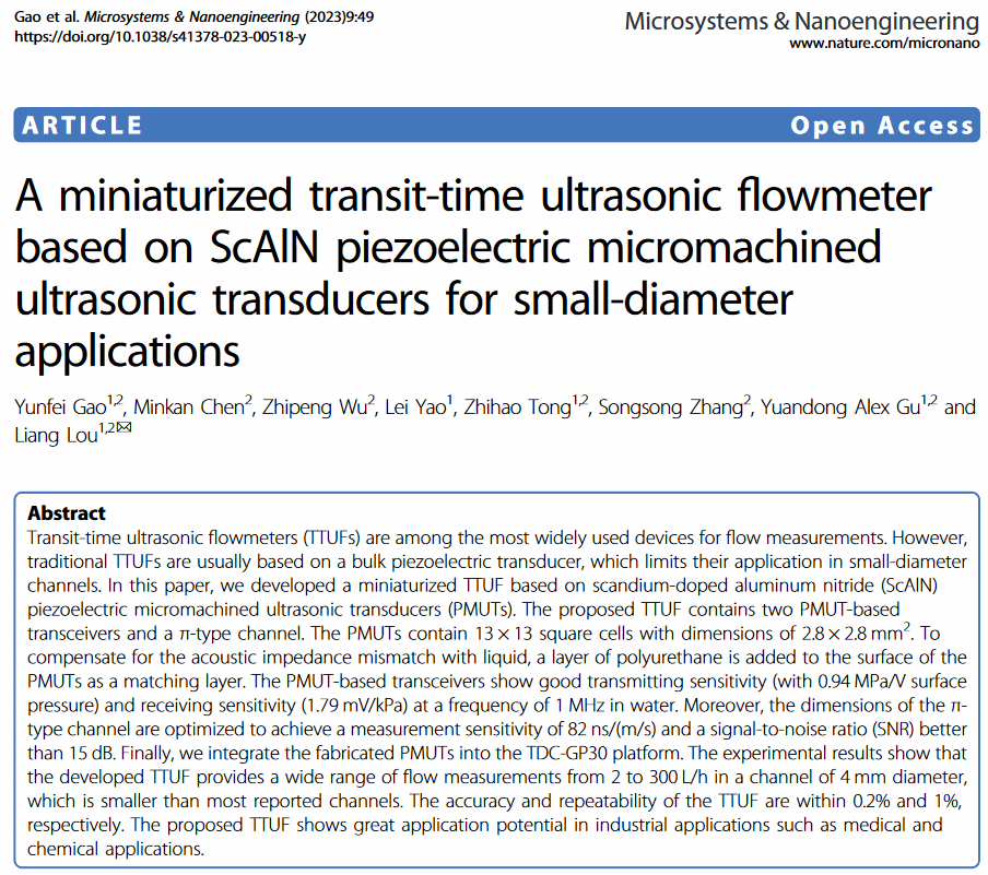 近期,365完美体育微电子学院“产教融合”传来捷报。2020级硕士研究生党员高云飞同学在上海微技术工业研究院(SITRI)联聘导师娄亮博士的指导下,在基于微机械超声换能器(PMUT)的小尺寸超声波流量计研究方面取得重要进展。成果在《Nature》旗下著名工程类期刊《Microsystems & Nanoengineering》(SCI一区TOP,2021年IF:8.006)发表,并被国际电气与电子工程师学会微机电系统旗舰年会36th IEEE MEMS接收。高云飞同学为第一作者,娄亮博士为通讯作者。365完美体育为第一完成单位,上海微技术工业研究院为合作单位。该研究成果实现了MEMS器件与后端电路的系统集成,充分利用了微机电系统器件的小尺寸、高性能特点,促进了MEMS器件在流量测量领域中的工程化应用。
