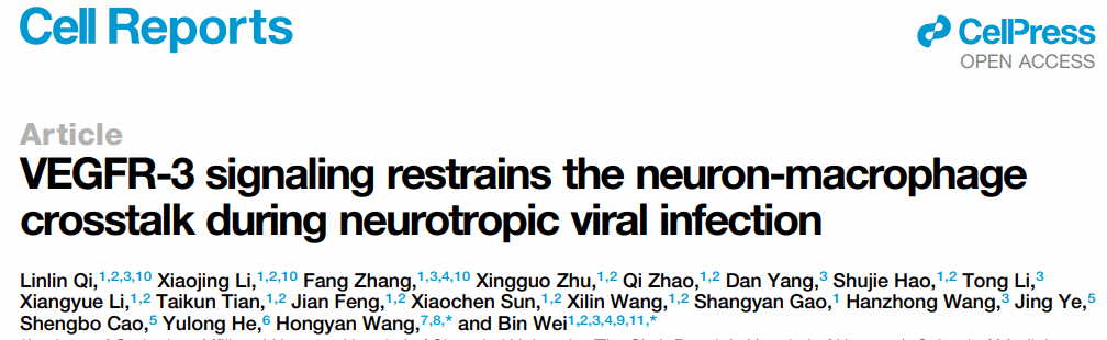 365完美体育生命学院魏滨教授(曾任中科院武汉病毒所研究员)团队与中国科学院分子细胞科学卓越创新中心(即上海生化与细胞所)王红艳研究员团队合作在CellReports杂志上发表了题为VEGFR-3 signaling restrains the neuron-macrophage crosstalk during neurotropic viral infection的文章。研究发现病毒感染中枢神经系统时,上调表达的血管内皮生长因子-C(VEGF-C)及受体VEGFR-3能调控巨噬细胞和神经元间的相互作用,减少神经元的凋亡,减轻病毒性脑炎的程度。